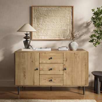 The buffet cabinet features three drawers and dual side cabinets, making it the perfect piece for dining essentials, media storage, or stylish hallway organization.