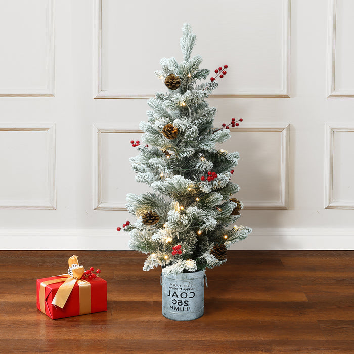 To create a festive environment this season, decorate your home, office, or special event with this sweet 3-foot artificial tree. Crafted from a combination of quality PVC and PE branches, this holiday decoration is made to bring Christmas cheer for years to come. Designed and decorated to feel lifelike and realistic, the lush artificial pine tree is flocked to give a snowy appearance, adorned with pine cones and berries. It has the added convenience of pre-strung lights. The pre-strung lights are powered by 4 AA batteries (not included) and have a convenient 6-hour timer. Family and guests will marvel at the transformation of your home into a beautiful winter wonderland capturing the beauty and charm of the holidays. In addition, this artificial pine tree is featured in a rustic silver farmhouse-style round metal pot that complements the natural beauty of the faux tree. The tree also makes a beautiful and creative gift for that special person this holiday!