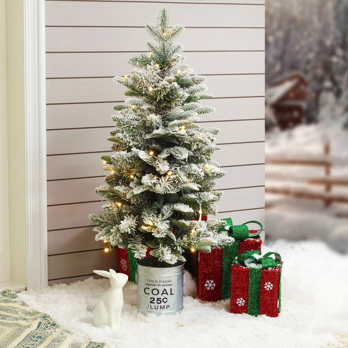 To create a festive environment this season, decorate your home, office, or special event with this sweet 3-foot artificial tree. Crafted from a combination of quality PVC and PE branches, this holiday decoration is made to bring Christmas cheer for years to come. Designed and decorated to feel lifelike and realistic, the lush artificial fir tree is flocked to give a snowy appearance. In addition, it has the added convenience of pre-strung lights. The pre-strung lights are powered by 4 AA batteries (not included) and have a convenient 6-hour timer. The artificial fir tree is featured in a rustic silver farmhouse-style round metal pot that complements the natural beauty of the faux tree. The tree also makes a beautiful and creative gift for that special person this holiday!
