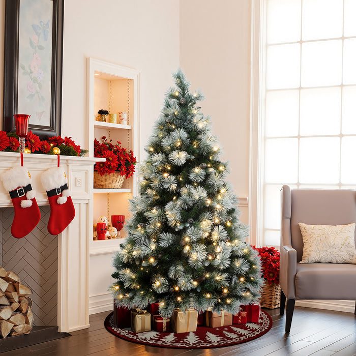 This 6ft Pine Christmas Tree. green branches rich emerald ,delicate simulated snow, Complete with pinecones accents , warm white lights effortlessly creates wintery vibe.