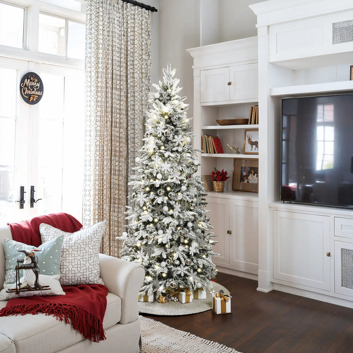 Illuminate your festive celebrations with the enchanting glow of our 6-foot Pre-Lit Snow-Flocked Christmas Tree, a centerpiece that promises to elevate your holiday decor to magical heights. Crafted with meticulous attention to detail, this Christmas Tree with Lights is not just a symbol of the season but a beacon of joy, pre-lit with 120 warm LED lights that cast a serene luminescence across any room.The tree stands tall and proud, boasting a robust collection of 680 branches, each meticulously flocked with pristine snow-flocking, adorned with a mix of silver and white balls and snowflakes that shimmer in the light. The durable metal stand ensures stability, allowing you to place your tree in any indoor setting without worry. Designed with convenience in mind, our Christmas tree features a structure that makes assembly effortless, allowing you to transition from box to full bloom in minutes. This feature, combined with the tree's stunning aesthetic and warm LED lights, creates a value proposition that's hard to resist.