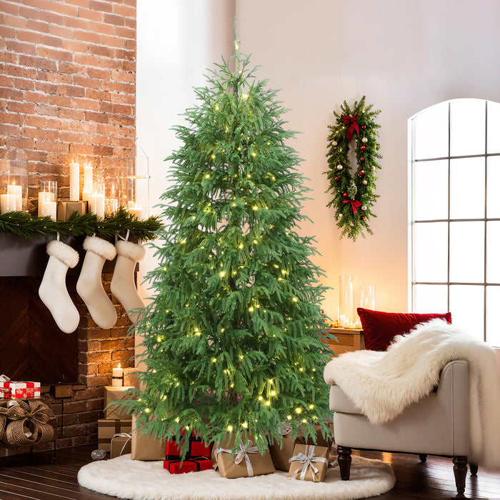 Crafted from high-quality PE material, offers 758 lush features 340 pre-installed warm white LED lights with 8 lighting functions. Its three-stage hinged branches ensure quick and easy setup while maintaining stability.