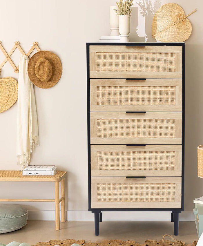 Need a space-saving design that keeps your room neat and organized? This mid-century modern-inspired chest is the solution. Create stylish storage with this 5 drawer vertical chest. The stylish bedroom dresser separates and stores all of your wardrobe and linen essentials, and make it easy to find and grab what you need right away. Crafted from high quality manufactured and solid wood, this mid-century modern dresser features woven rattan drawer fronts and a stunning black body that belongs right at home in a casual and airy setting. The five drawers give you lots of room to tuck away your wardrobe, and the woven drawer fronts add a natural look. This compact dresser is great for rounding out empty nooks and small-scale spaces. Add charm along with functional storage to any room in your home with this beautiful tall narrow dresser.