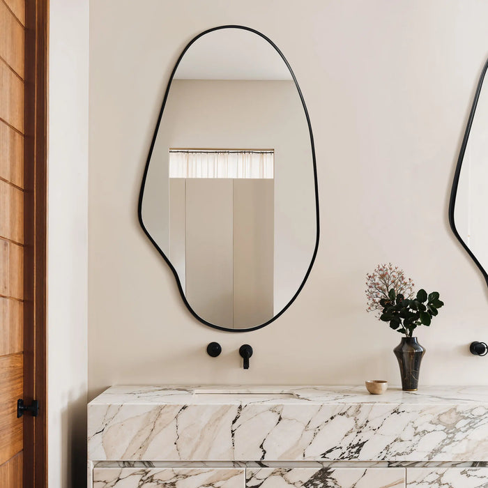 The irregular oval mirror has a unique design with a modern aesthetic, adding a fresh artistic touch to your living space. Crafted from high-quality MDF, the mirror is durable and has a smooth surface that's easy to clean. The black frame perfectly complements the mirror's oval shape, adding a touch of understated elegance and luxury. Whether mounted above a vanity, as an accent over an entryway table, or above a sink, this mirror enhances the beauty and functionality of any room. Its design prioritizes style and practical flexibility—you can choose to hang it vertically or horizontally to suit different space layouts and personal preferences. Its modern minimalist style allows it to seamlessly blend into various interior designs, becoming a striking focal point in your home.