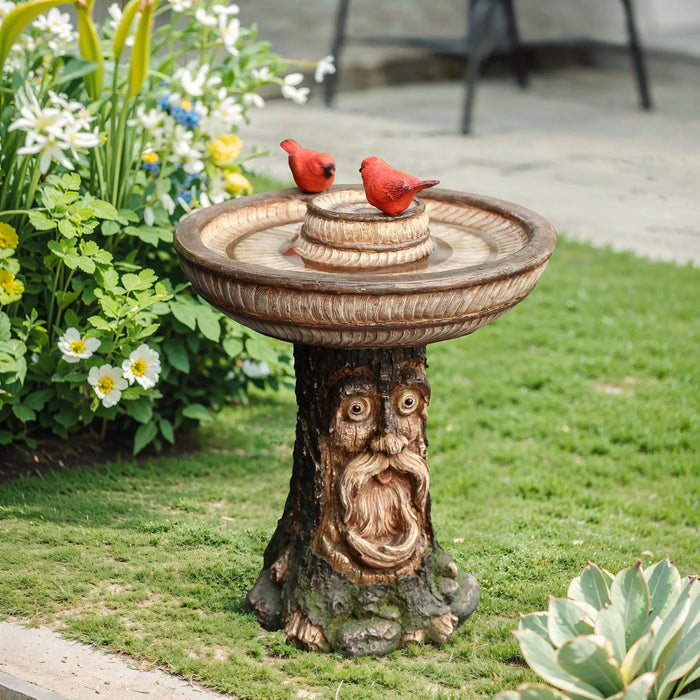 Transform your outdoor area into a charming sanctuary with this 23-inch brown old man tree resin birdbath. This delightful piece artfully combines nature with a playful touch, featuring a unique elderly tree design enhanced by two vibrant red birds. It serves as an eye-catching centerpiece for any garden or patio. Crafted from high-quality polyresin, the birdbath ensures durability and stability while being easy to maintain and clean. The brown trunk details replicate real bark textures, adding a natural flair to your decor. The two red birds perched on the tree appear to sing joyfully, bringing a sense of life and movement to the entire piece. This birdbath not only creates a welcoming environment for birds but also enhances your outdoor decor, infusing vitality into your outdoor space.