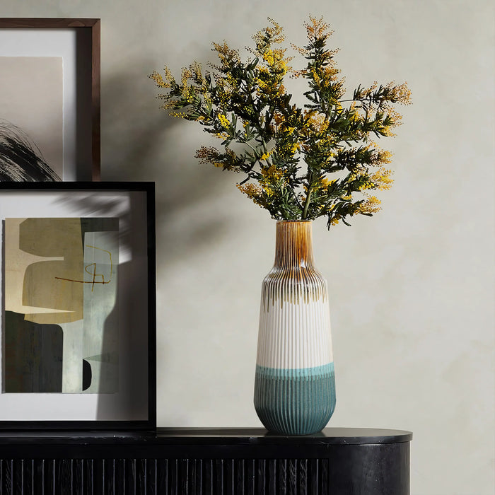 Elevate your home decor to new heights with this colorful and unique vase. Crafted from high-quality ceramic, this vase features gorgeous green and light brown tones with a neutral color scheme that makes it the perfect accent for any room. The unique vertical lines and multi-layered color gradient designs highlight simple, yet beautiful colors that are sure to catch the eye of anyone who enters your home. With the ability to create your own stunning centerpiece by adding your favorite flowers or greenery, this vase is a versatile addition to any home. It can also be used as a beautiful accent piece on any coffee table, mantle, shelf or table. Don't settle for ordinary home decor - add character and pizzazz to your space with this stunning vase.
