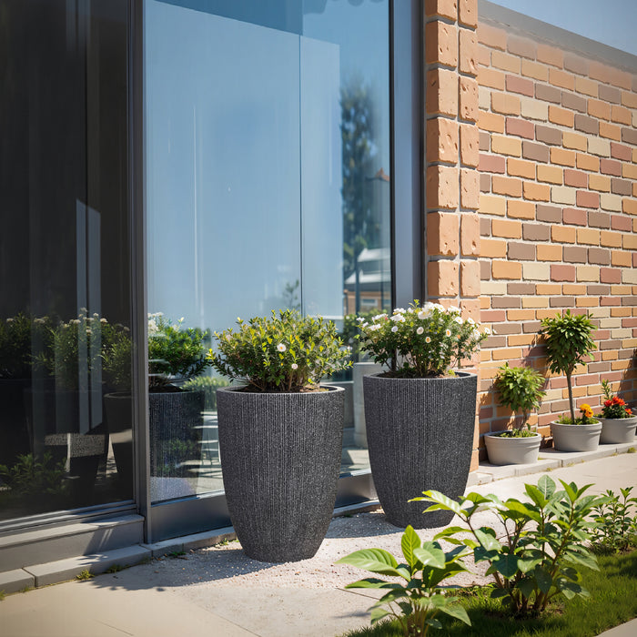 This tall black planter set features two ribbed planters perfect for adding height and style to your indoor or outdoor greenery. Each tall black planter is crafted from lightweight, durable material with a textured finish that complements modern and minimalist spaces. Ideal for entryways, patios, or living rooms, they offer a sleek solution for showcasing large plants while maintaining a clean, elevated look.