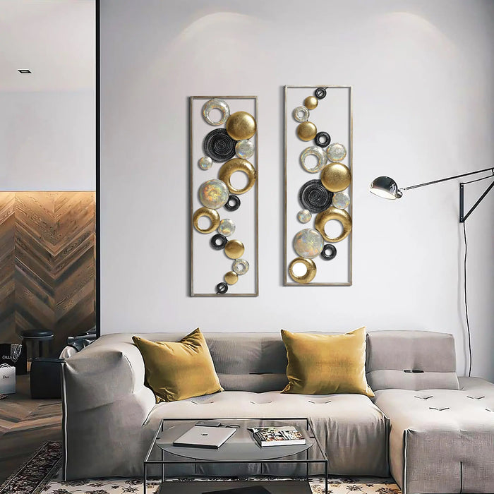 This collection of exquisitely crafted abstract metal wall decor presents a set of two wall hangings, adorned with a combination of metal rings and discs arranged in a unique style. Ideal for any conventional living space, these decorative pieces can be hung together or separately, showcasing your individual style and infusing your home with a touch of artistic elegance. This set of abstract metal wall decor has a stunning effect and can transform your traditional living space that is perfect for display in the bedroom, living room, dining room, and entryway, reflecting your unique personal style.