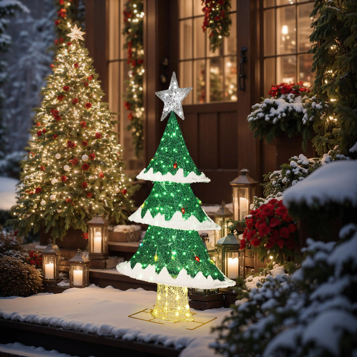 Illuminate your holiday with this enchanting Christmas tree adorned with colorful twinkling LED lights! Its timeless design will captivate your friends and guests. Whether placed indoors or outdoors, this tree will add a touch of magic to your holiday decor. Crafted from high-quality materials, each layer of the tree features imitation branches adorned with plush to create a snowfall effect, especially enchanting when illuminated at night.