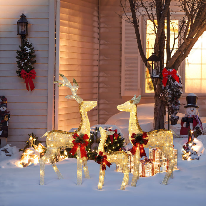 This stunning Deer Family Yard Decoration. Adorned with glitter, bows, these glowing reindeer are sure to light up your yard.