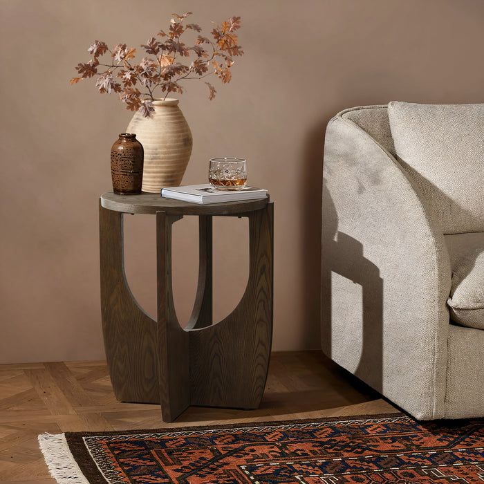 Elevate your home with this walnut side table, designed to blend mid-century elegance with modern functionality. The smooth walnut veneer finish adds warmth, while the round tabletop offers the perfect spot for morning coffee, a reading lamp, or favorite décor. Supported by a sturdy cut-out base, this round side table is both stylish and reliable, ideal for daily use. Whether placed in the living room beside a sofa, in the bedroom as a modern side table, or even in an office corner, it adds versatility to your home. Pair with other wood side table designs to create a cohesive look, or let it shine on its own as a statement piece. Bring comfort, style, and convenience to any room.