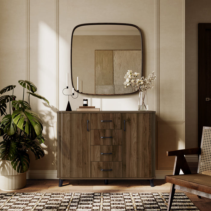 This mid-century walnut wood sideboard cabinet brings together modern design with functional storage. Its rounded corners and realistic wood veneer finish create a timeless aesthetic, perfect for any home.