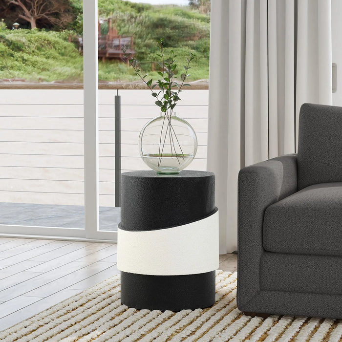 This metal side table features a round black base with a striking white contrast band, blending modern minimalist design with artistic appeal.Crafted from durable metal, the table offers strong stability even when holding heavy items. The bold black finish with an irregular white wrap gives the piece a sculptural look. This round side table is not only functional but also a statement accent that complements multiple home styles.Whether placed beside a sofa, in the living room, or in the bedroom, this black side table brings a modern touch and serves as a conversation starter in your décor.Add this modern side table to your home today and enjoy furniture that doubles as art.