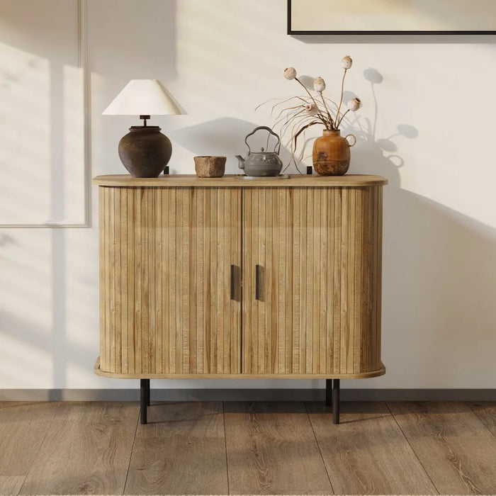 Elevate your space with this Mid-Century Modern Accent Cabinet, a perfect blend of form and function. Featuring fluted sliding doors, clean lines, and tapered legs, this small cabinet delivers timeless style in a compact footprint. Designed as an ideal cabinet for living room storage or entryway organization, it offers a modern slatted look that brings depth and texture to any room. Crafted from quality MDF with a warm wood finish, this Fluted Storage Cabinet is perfect for storing books, décor, or everyday essentials—without taking up too much space.