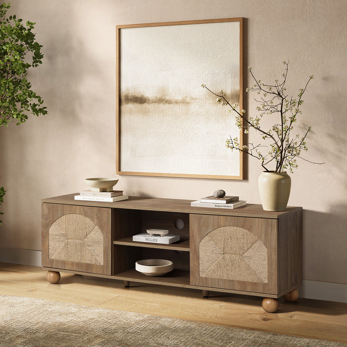Crafted from engineered wood with a natural veneer, the stand features two handwoven arched doors with hidden handles for a sleek look. The central open shelf is perfect for your media devices, while the pre-drilled cable holes keep wires neatly organized.