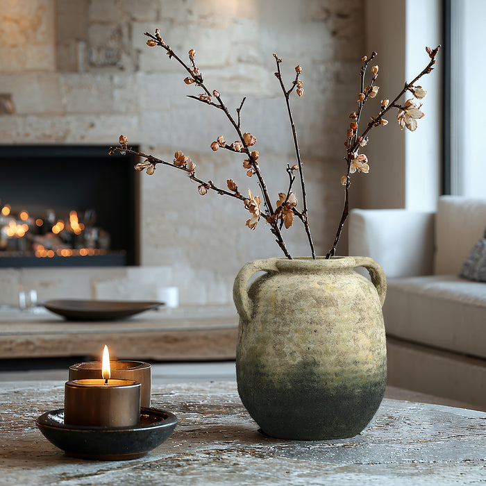 This vintage-style Round Terracotta Vase. Handcrafted from high-quality clay, it boasts a distressed surface with mottled green,off-white tones.