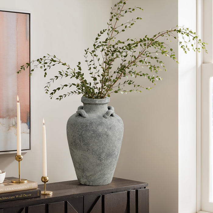 Hand-painted with a distressed gray finish, with tall amphora shape,integrated handles, reveals natural crackles, tone variations, enhancing its antique look. Its sturdy design ideal for holding dried branches, pampas grass, simply serving as a sculptural accent.
