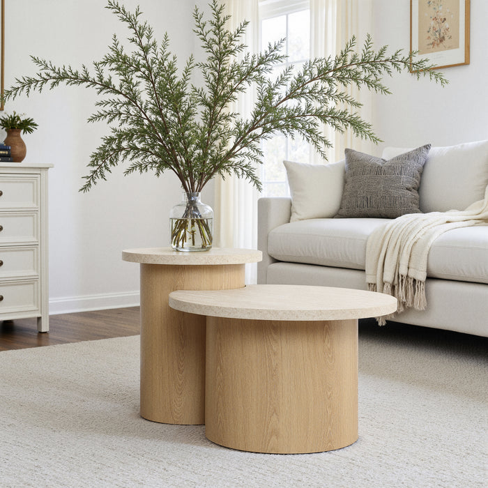 Each table combines a soft-beige travertine-look marble-effect top with a chunky, one-piece cylindrical pedestal base in warm wood grain. Made from durable manufactured wood, these tables bring clean.