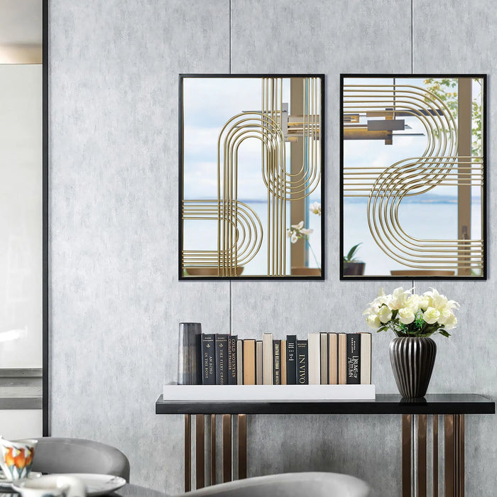 Enhance the aesthetic of your living space with this stunning wall mirror decoration set, comprising of exquisite metal loops in gold. The wall art pieces are expertly crafted from premium quality iron and measure 17.91 inches by 25.98 inches, allowing you to transform any empty wall into a captivating modern masterpiece. Perfectly suited for pairing with a console table or side tables, this set exudes a chic mid-century modern vibe that will elevate the ambiance of your living room, home office, or entryway.