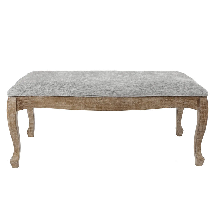 Add the hint of old-world charm to this space with this elegant upholstered bench featuring gracefully curved legs. The warmth of the wood finish with gray highlights and the simplicity of the linen upholstery make this bench the perfect choice for any living space in your home. The bench has multi-purpose uses, such as, place it at the end of your bed, in the entryway, or make it the centerpiece of your living room that is both pleasing to the eye while providing additional sitting.
