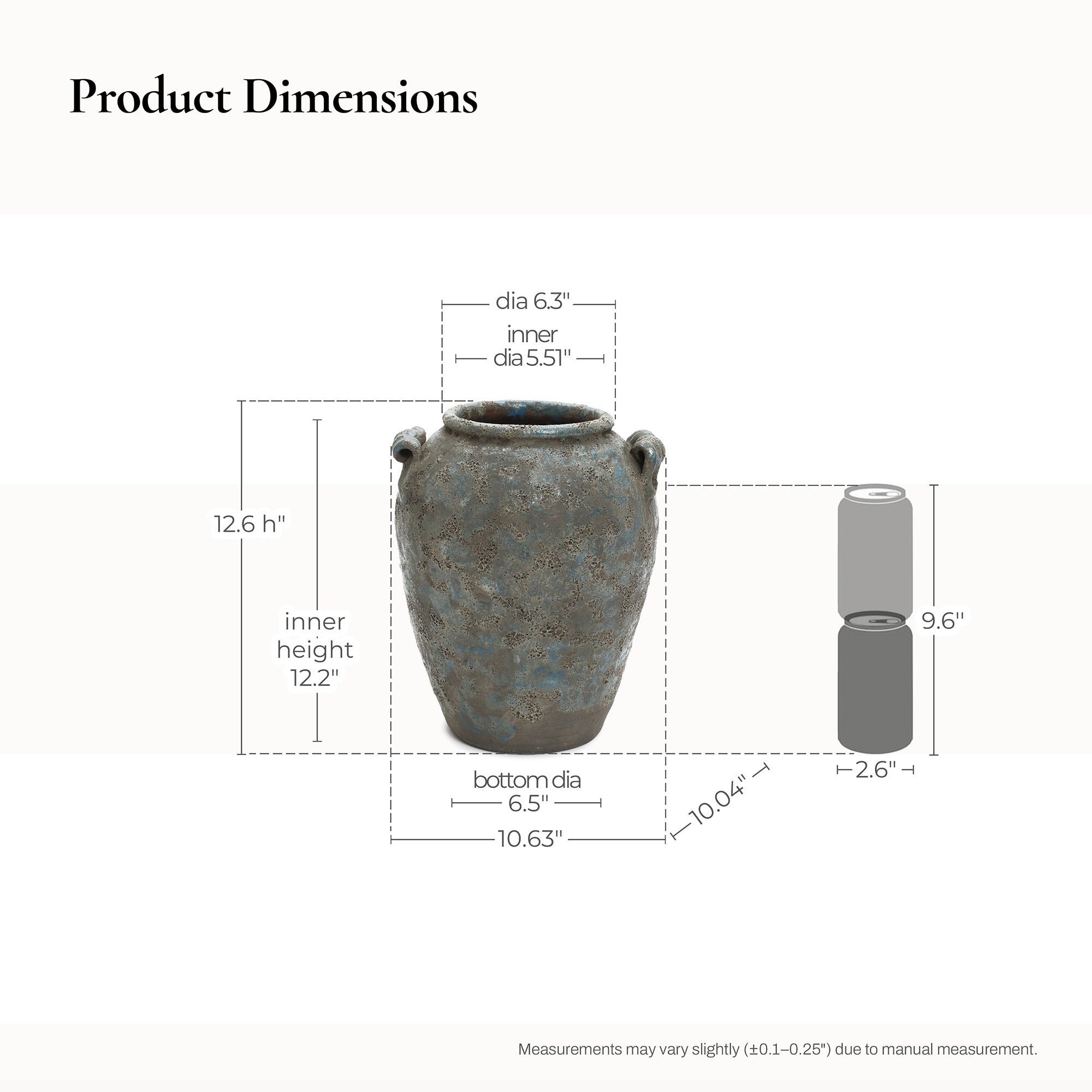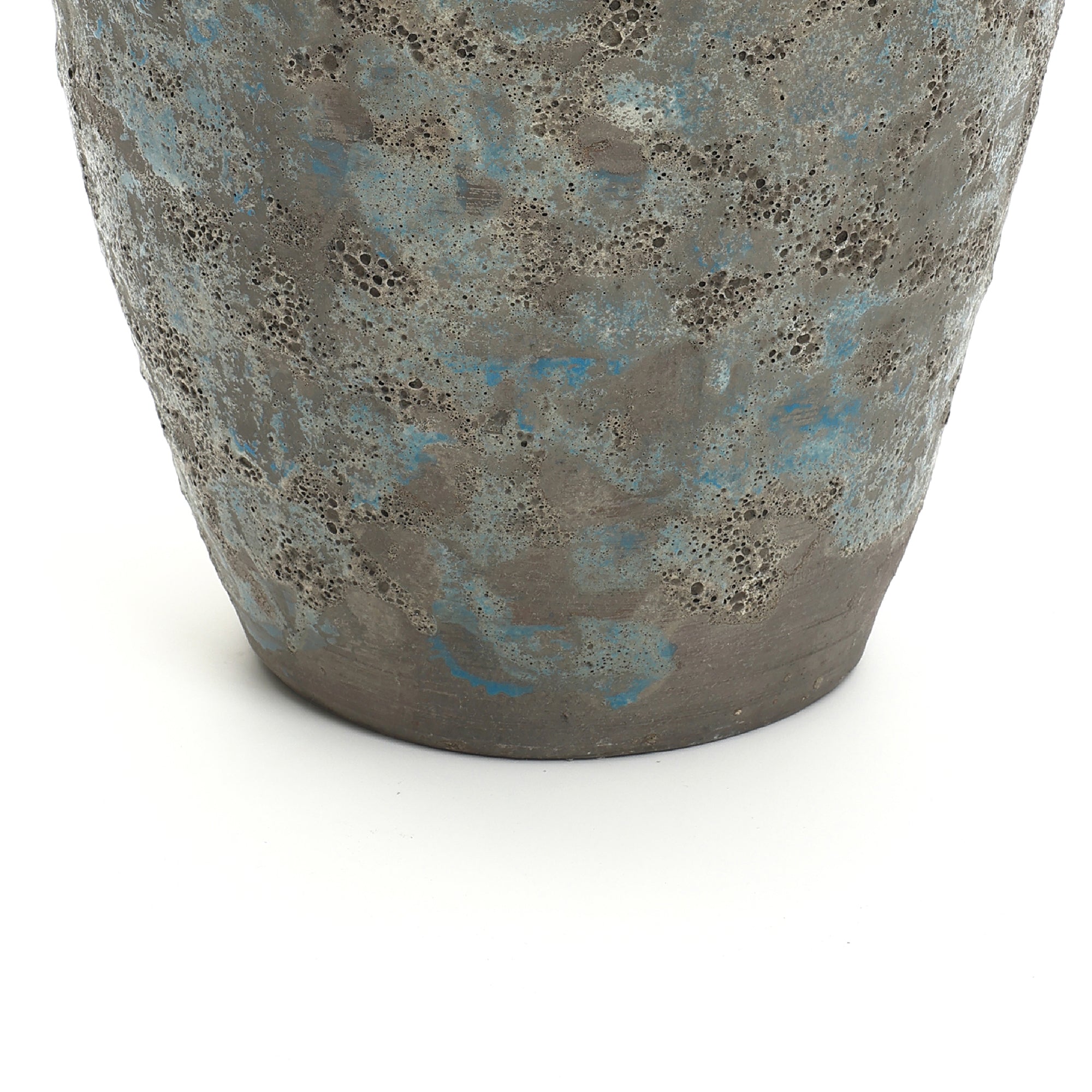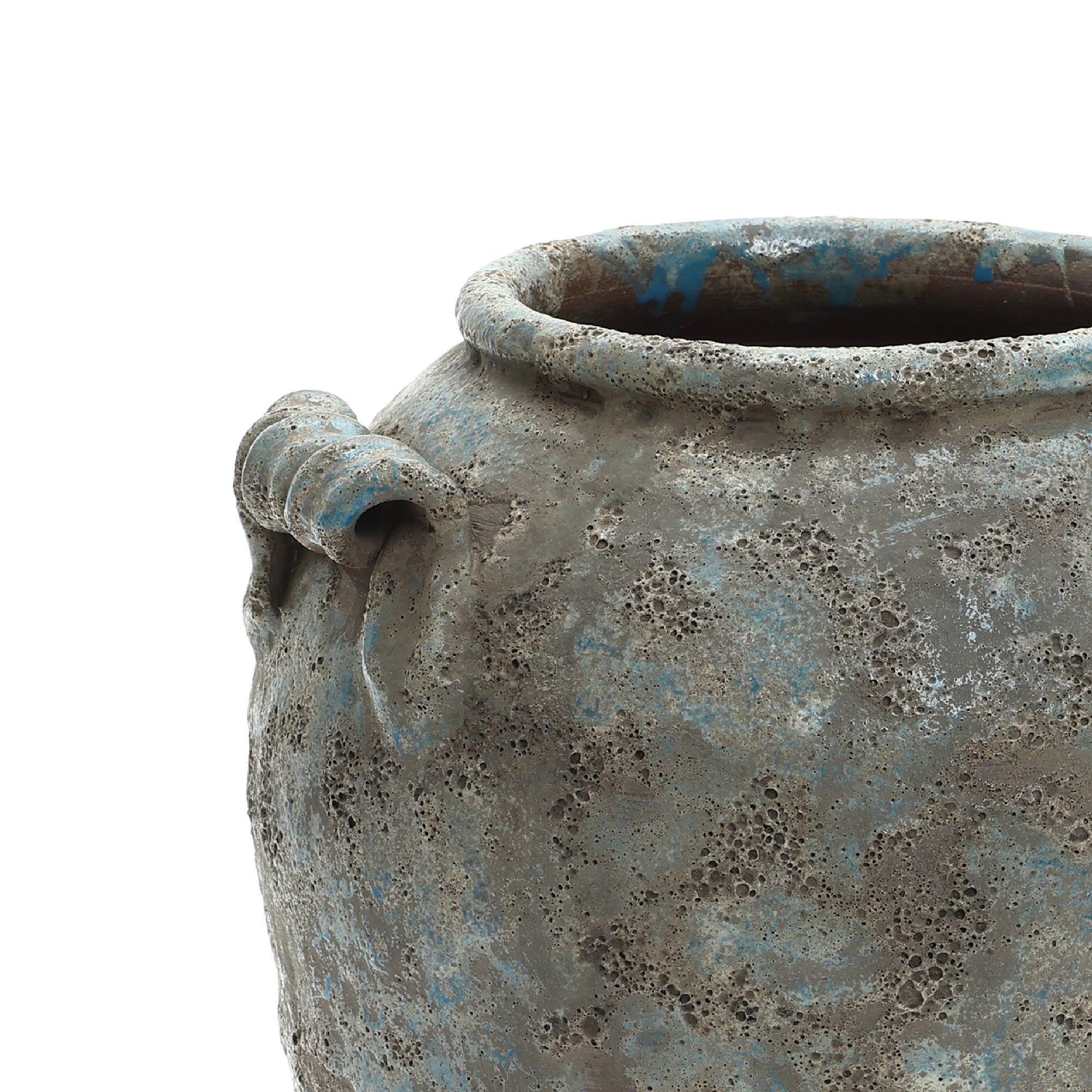 This antiqued blue , brown Terracotta Vase with Handles. Featuring a hand-applied bubble glaze ,distressed, brings vintage character ,artisanal appeal to any space.