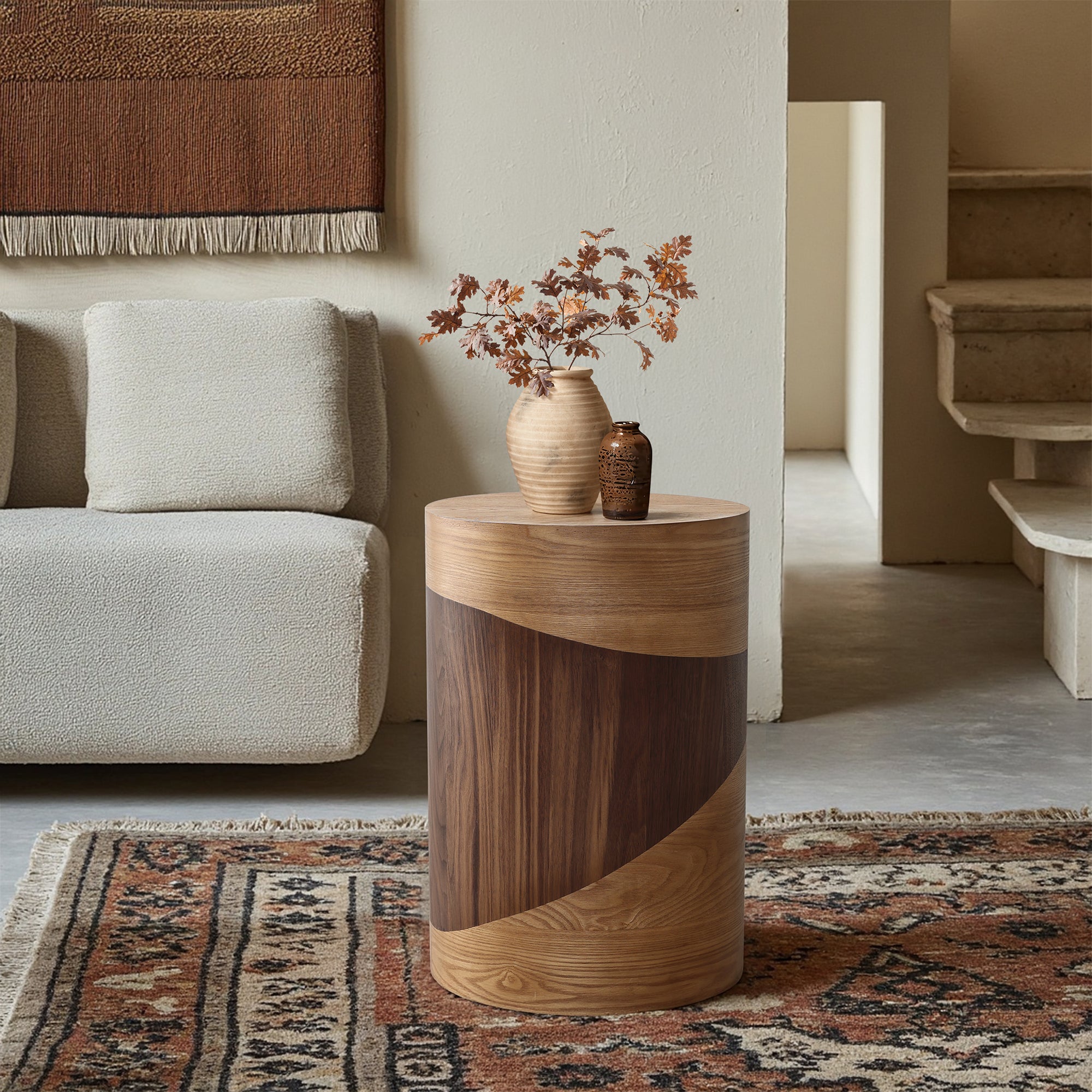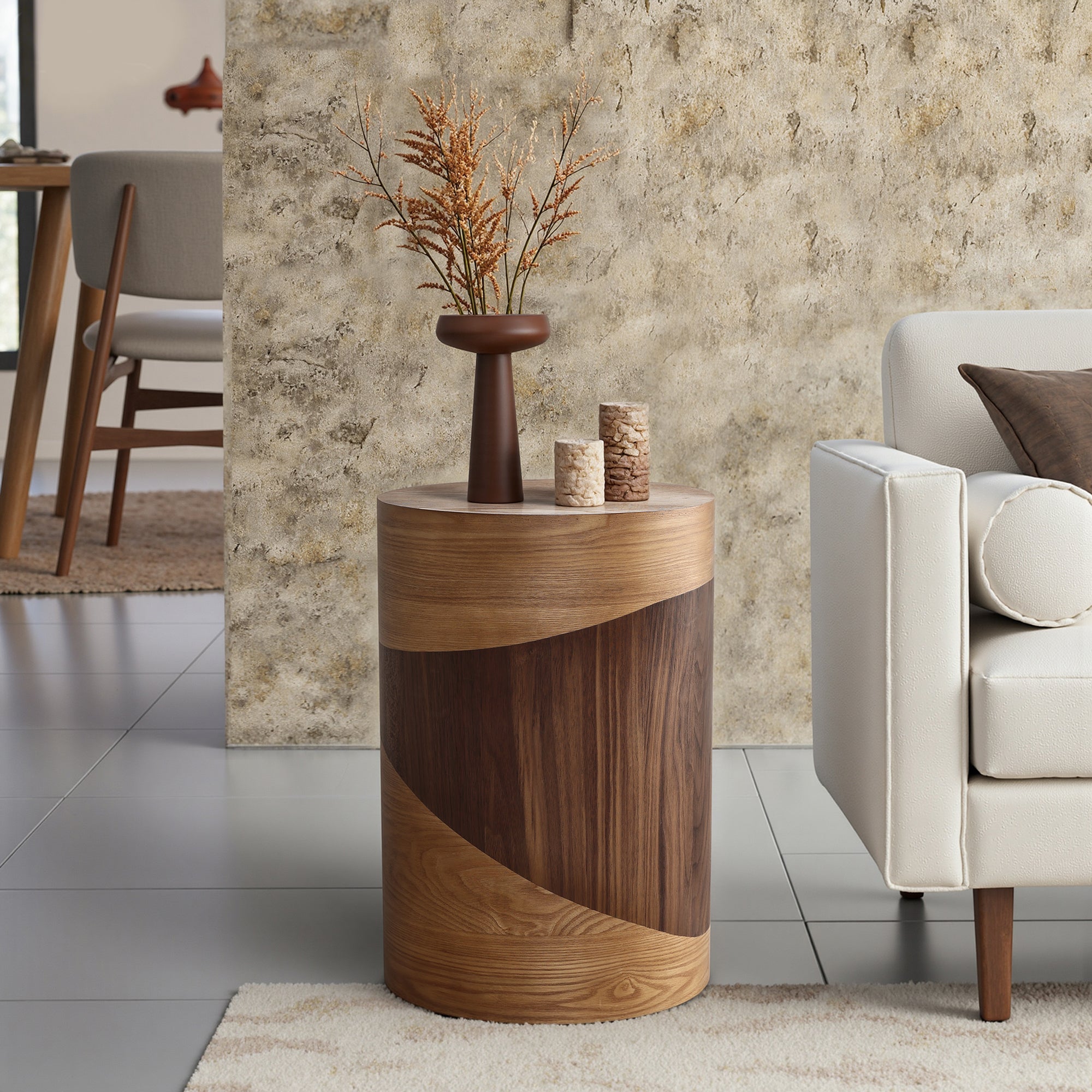 • Modern Rustic Style: Round cylindrical side table featuring a mix of natural &dark wood finish, blending rustic warmth.