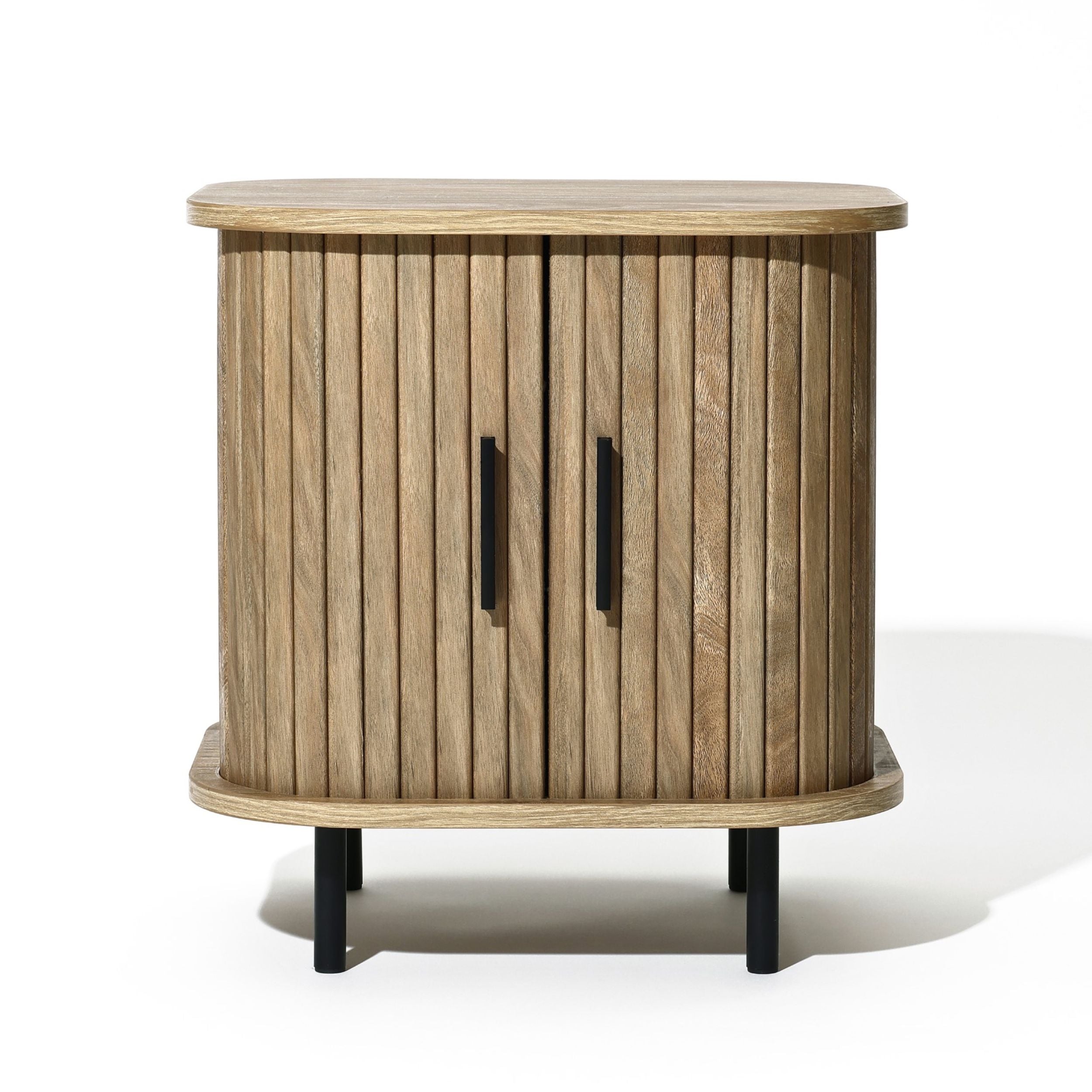 • Mid-Century Appeal: Sliding tambour doors add timeless design to a wooden nightstand