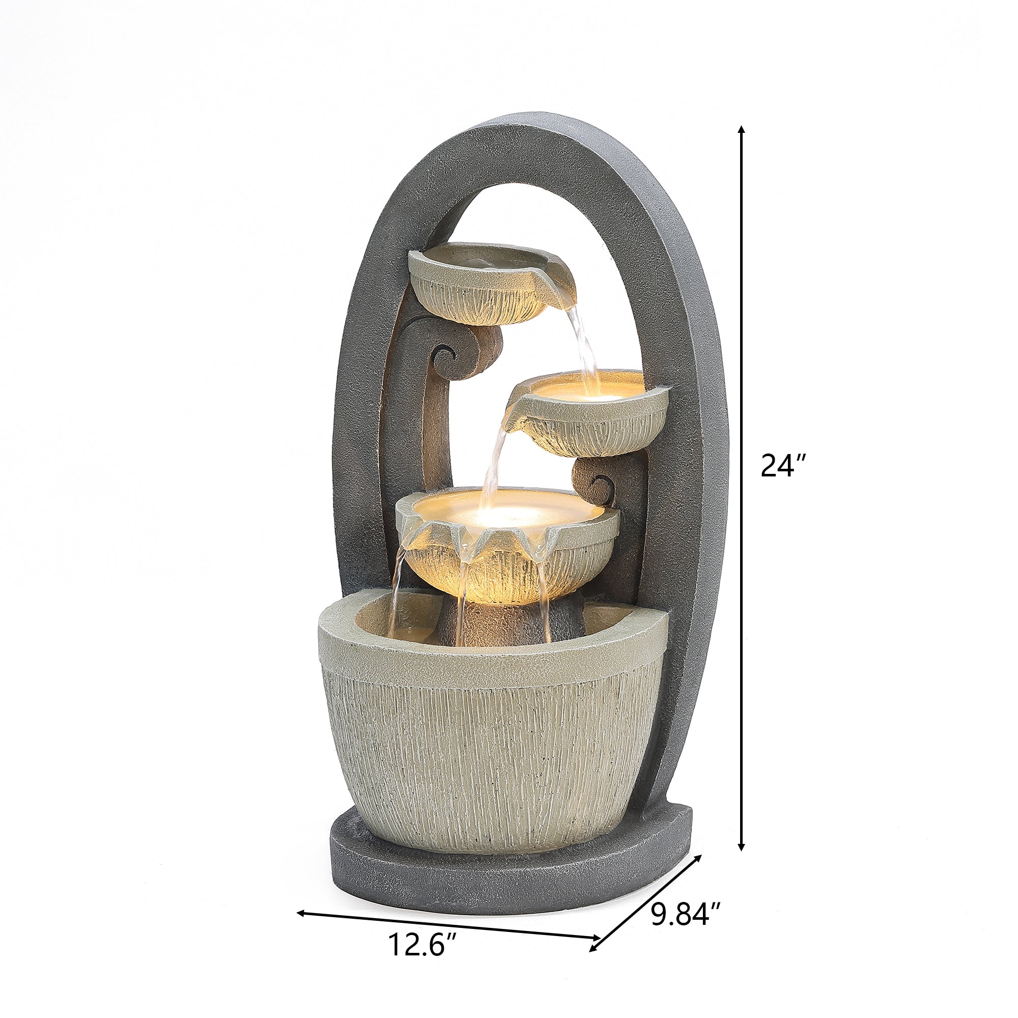 Water flows gently through this cascading bowls water fountain, bringing a sense of movement and tranquility to your outdoor space. Designed with a modern oval silhouette and tiered bowl structure, it creates a soft, relaxing sound. Crafted from durable gray resin and enhanced with built-in LED lights, this cascading bowls water fountain is perfect for patios, garden corners, or entryways—offering both style and serenity.
