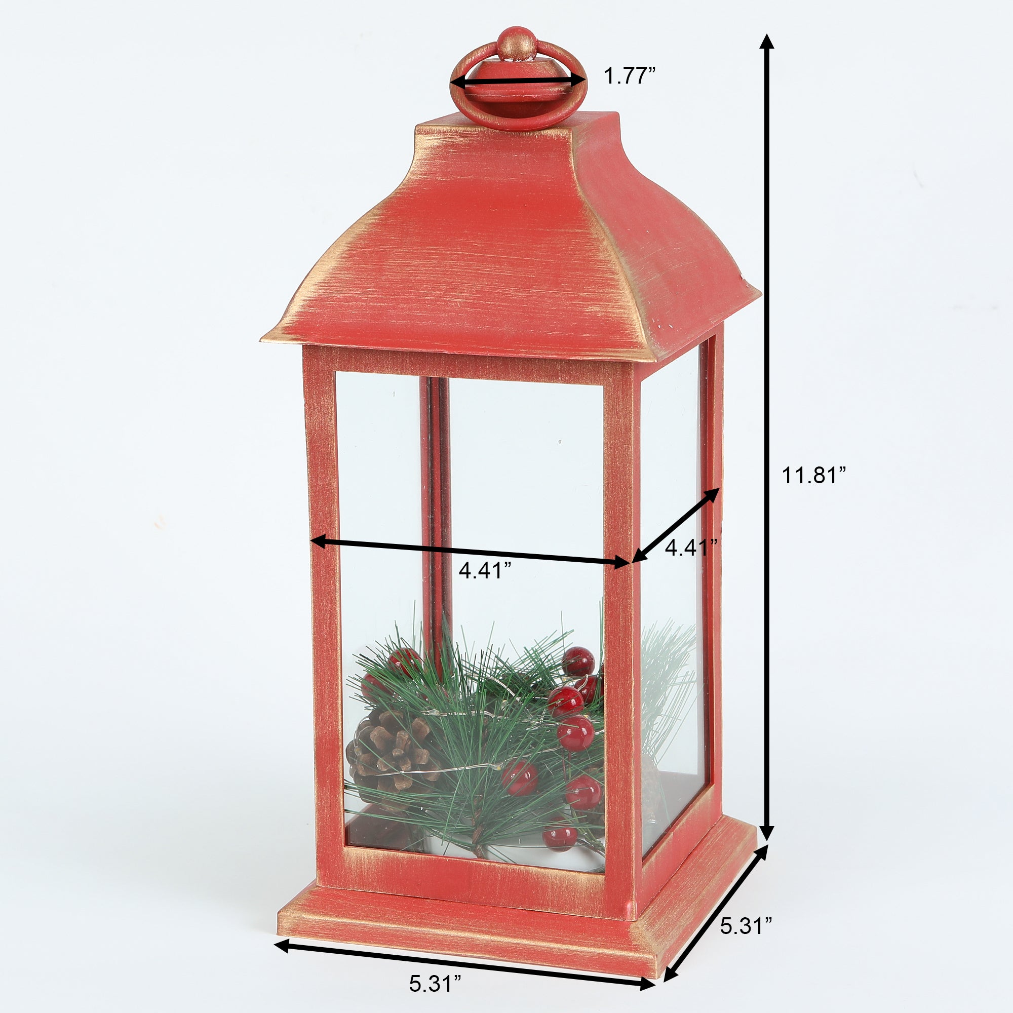 Complete your holiday decorations with this beautiful red with brushed gold lantern. The holiday lantern features decorative pine needles, cones, and red holly berries, with a string light that provides a warm glow to this special season. Make it a part of your tabletop or mantel centerpiece. The rustic and natural style of the lantern will add to the beauty of your existing decor. The lantern is battery operated (3 AAA batteries, not included) with a simple on-off switch on the bottom of the lantern. This holiday lantern makes a great addition to your home and a gift for your friends or family!