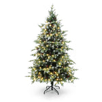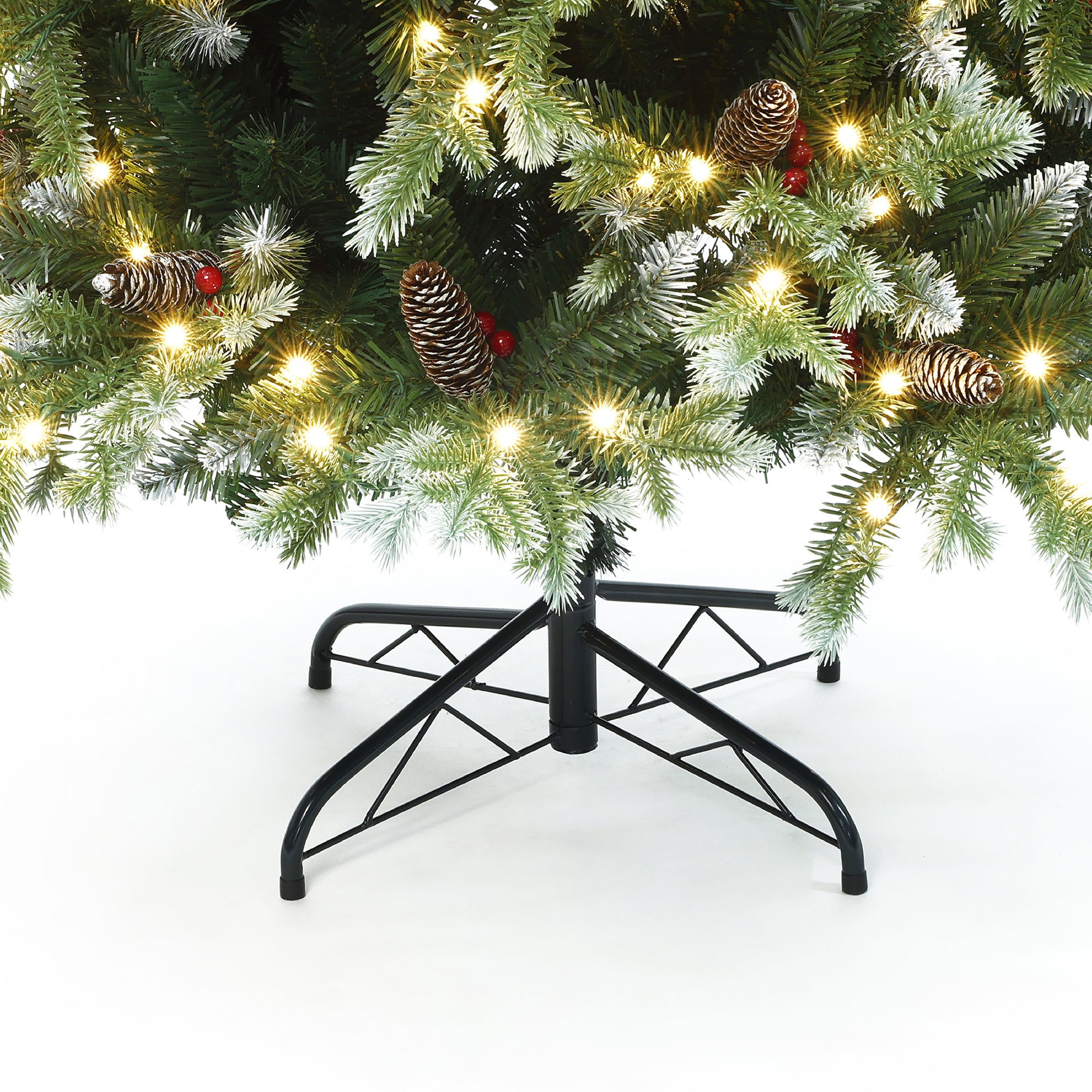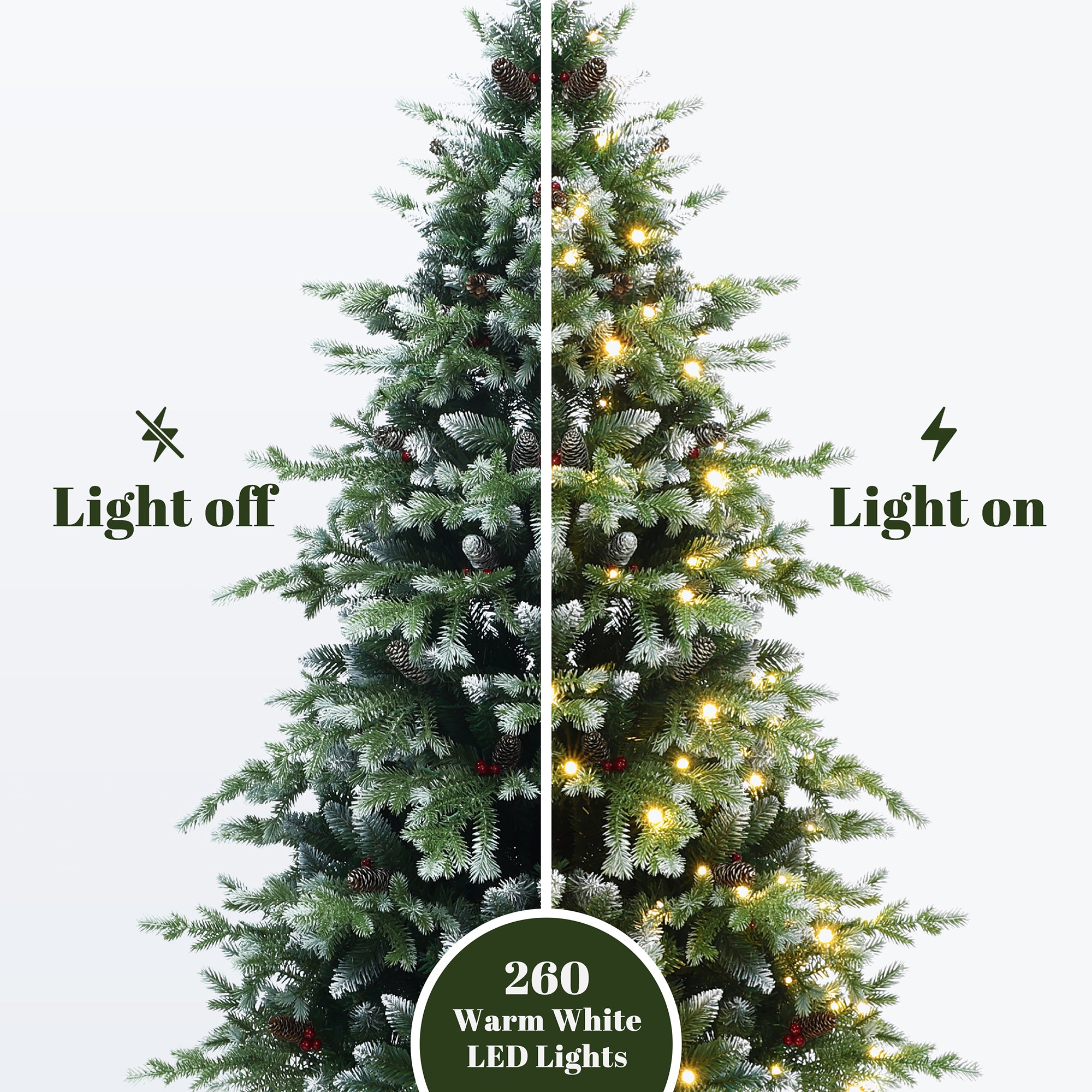 This 6ft frosted Full Christmas Tree, featuring 1724 lush branches and 260 warm LED lights, with snow-kissed tips, frosted pinecones, vibrant red berries, captures the charm of a winter wonderland.
