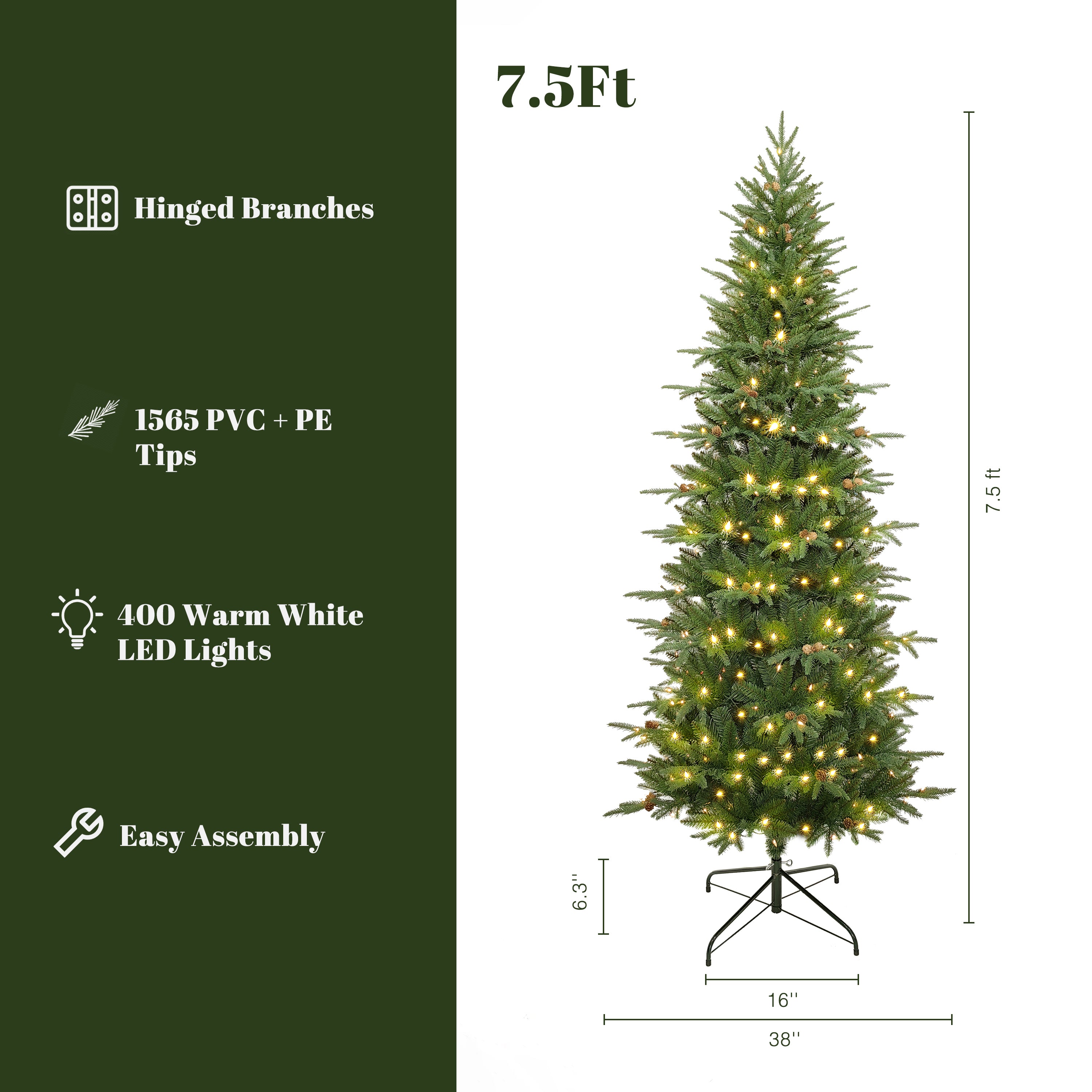 7.5Ft Pre-Lit Green Slender Artificial Christmas Tree with Pine Cones