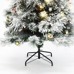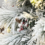The tree Made from high-quality PVC material decor with red berries , pinecones, each lightly dusted with faux snow for realistic, frosted look. Warm white lights cast inviting glow,  the sparkling star topper brings touch of magic to your holiday display.