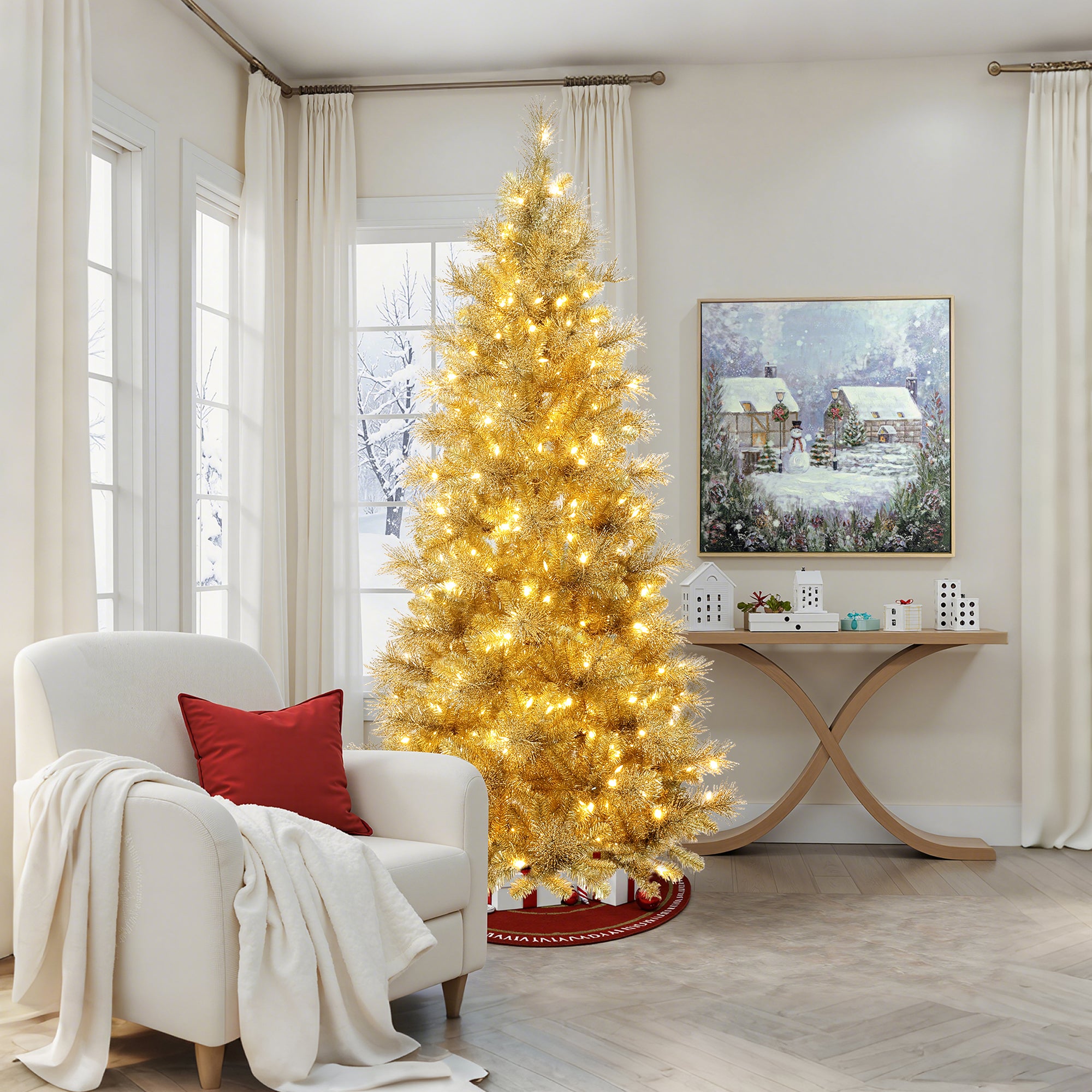 This stunning 7.5Ft Pine Christmas Tree, designed to elevate your holiday décor with its radiant golden branches and leaves.