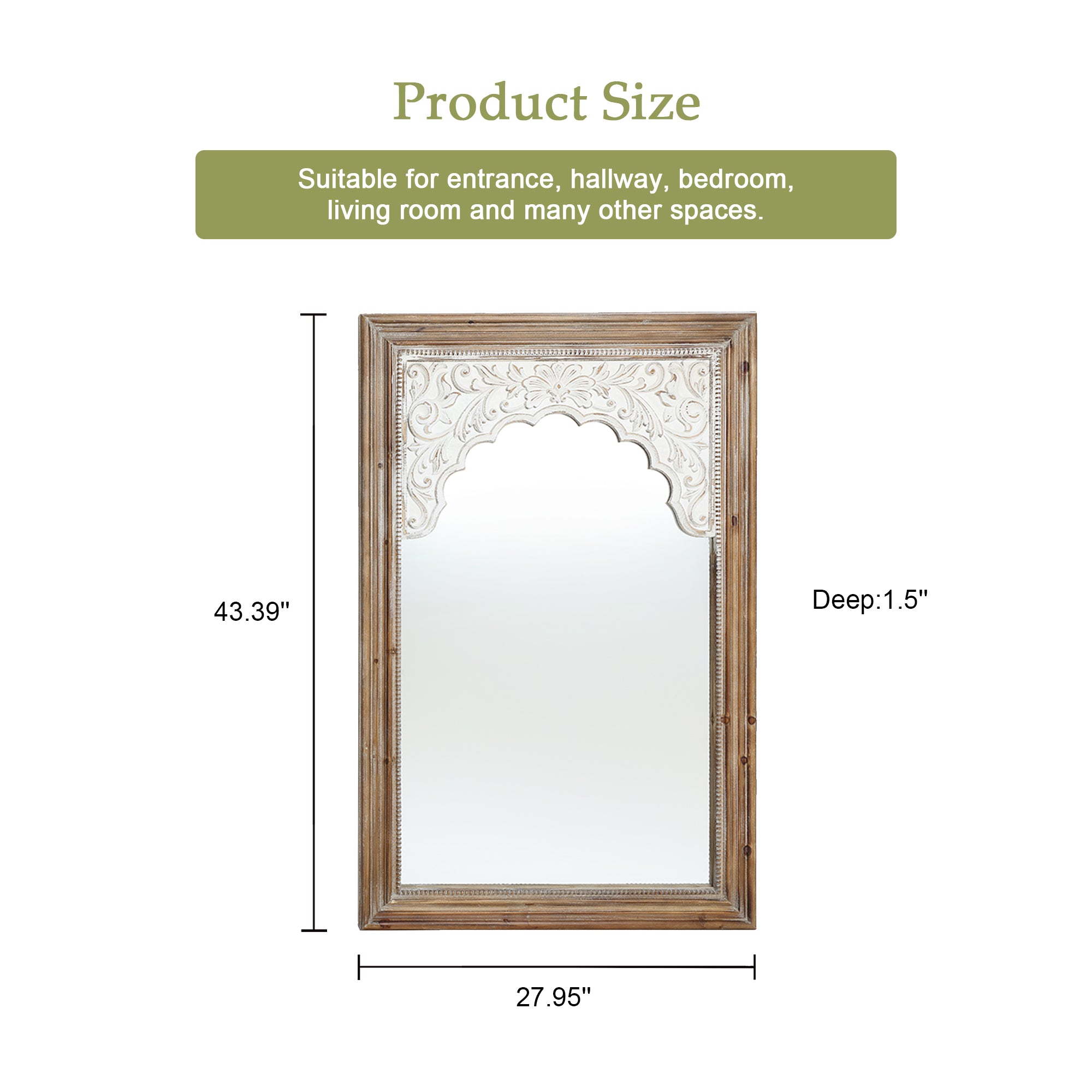 Looking for the perfect wall decoration that reflects your image and meets your needs? This accent wall mirror is made of sturdy solid wood with a chic farmhouse design. Its intricate hand-carved top adds a classic rustic charm, making it the perfect piece for enhancing the decor of your entrance, hallway, or powder room. It comes ready to mount and will elevate the ambiance of your home. At the same time, it is also practical and can help you check your outfit or place at the door for the final grooming.