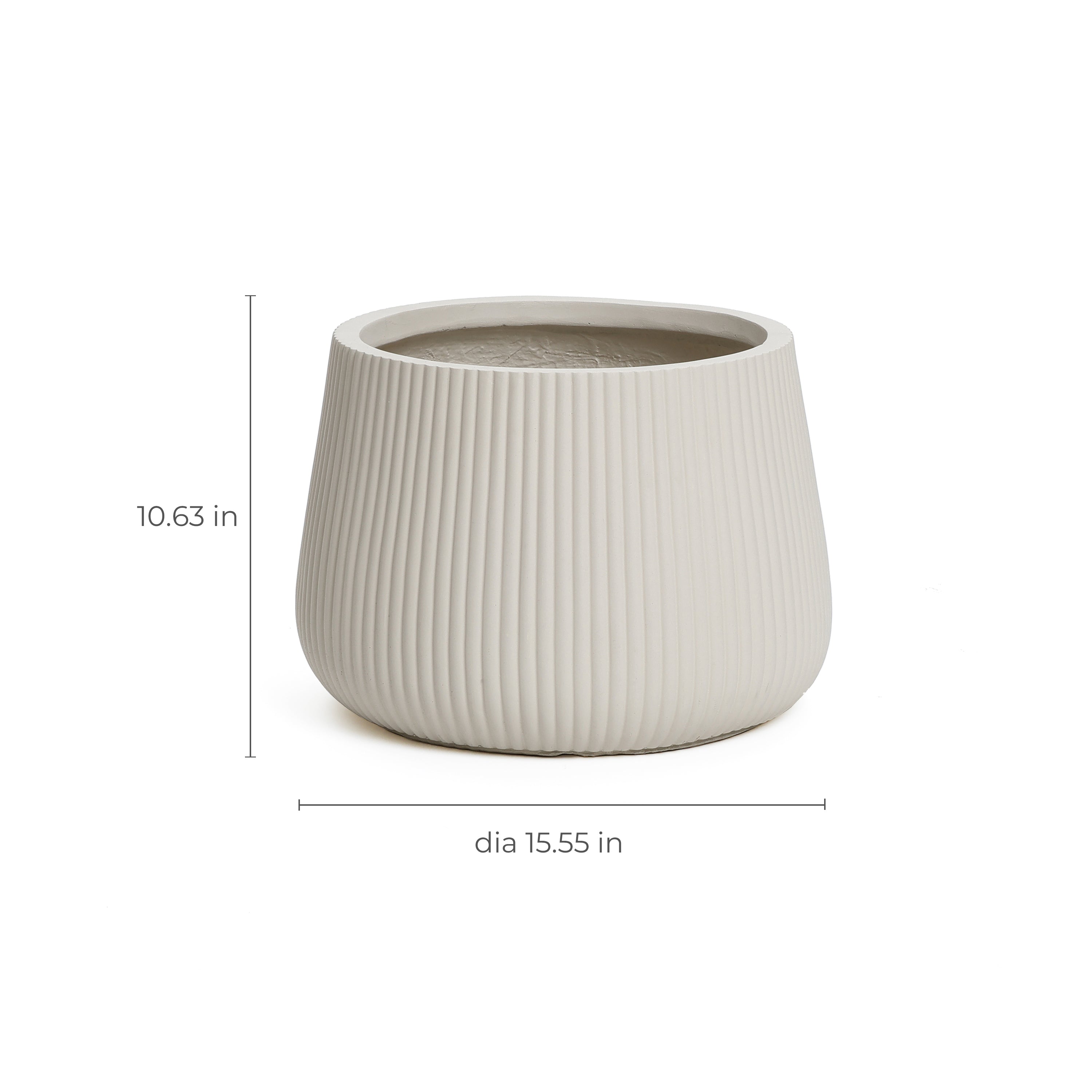 With its subtle off-white finish and vertical ribbed texture, this 15.55-inch round planter makes an ideal addition to any space needing a touch of style. Perfect as one of your go-to accent planters, it complements both modern and transitional decor. The clean form pairs beautifully with greenery or dried arrangements, while its lightweight build ensures effortless placement indoors or on covered patios. These accent planters offer both function and understated elegance.