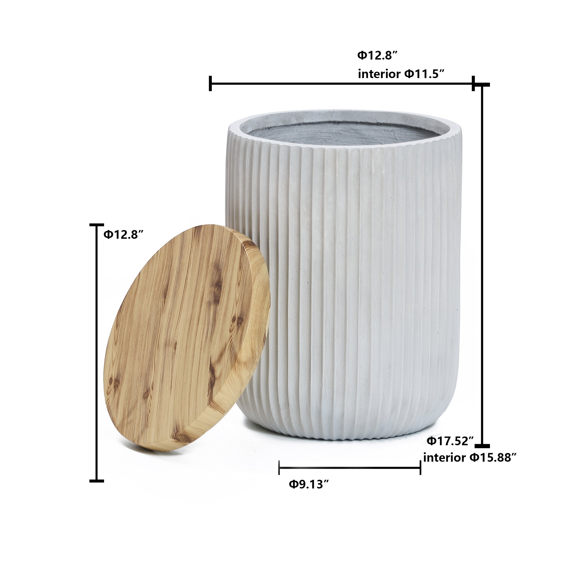 - Table has round textured body that makes a shapely table and includes interior storage option and a removable faux wood lid