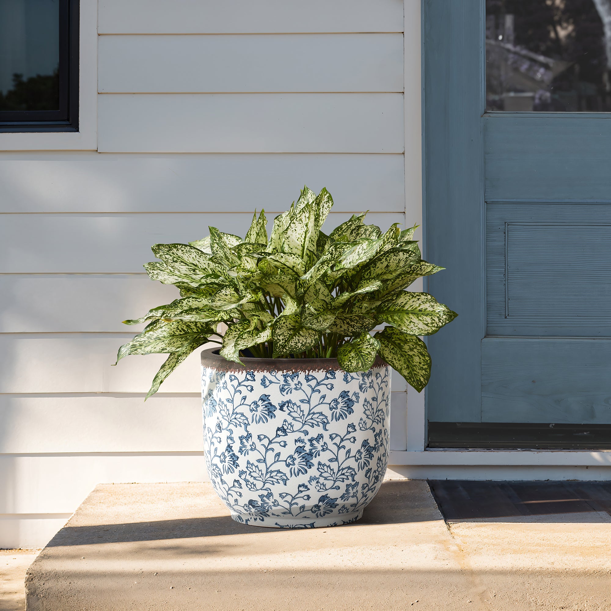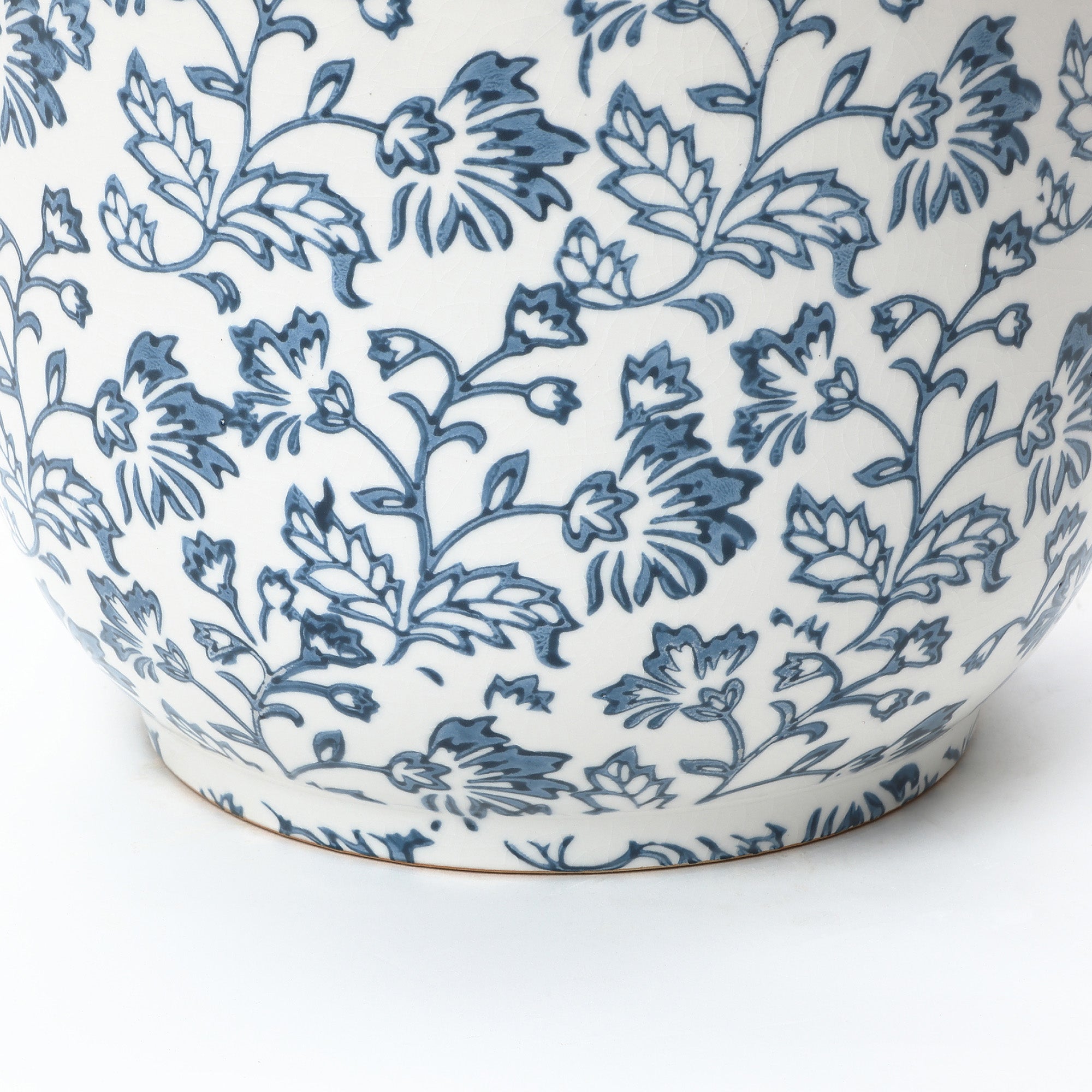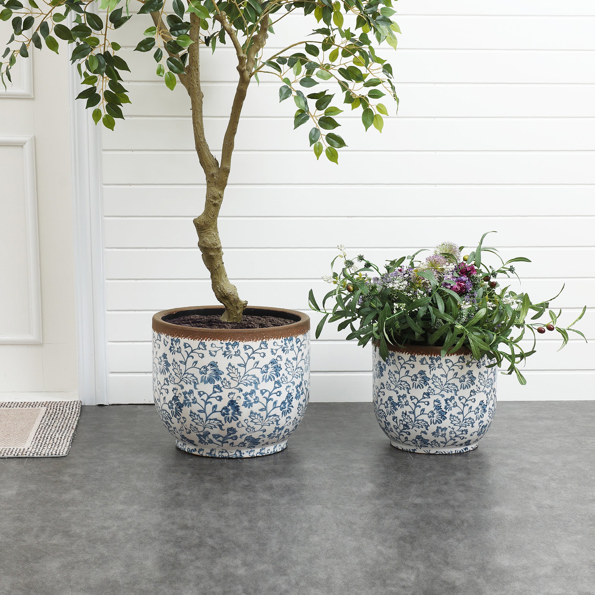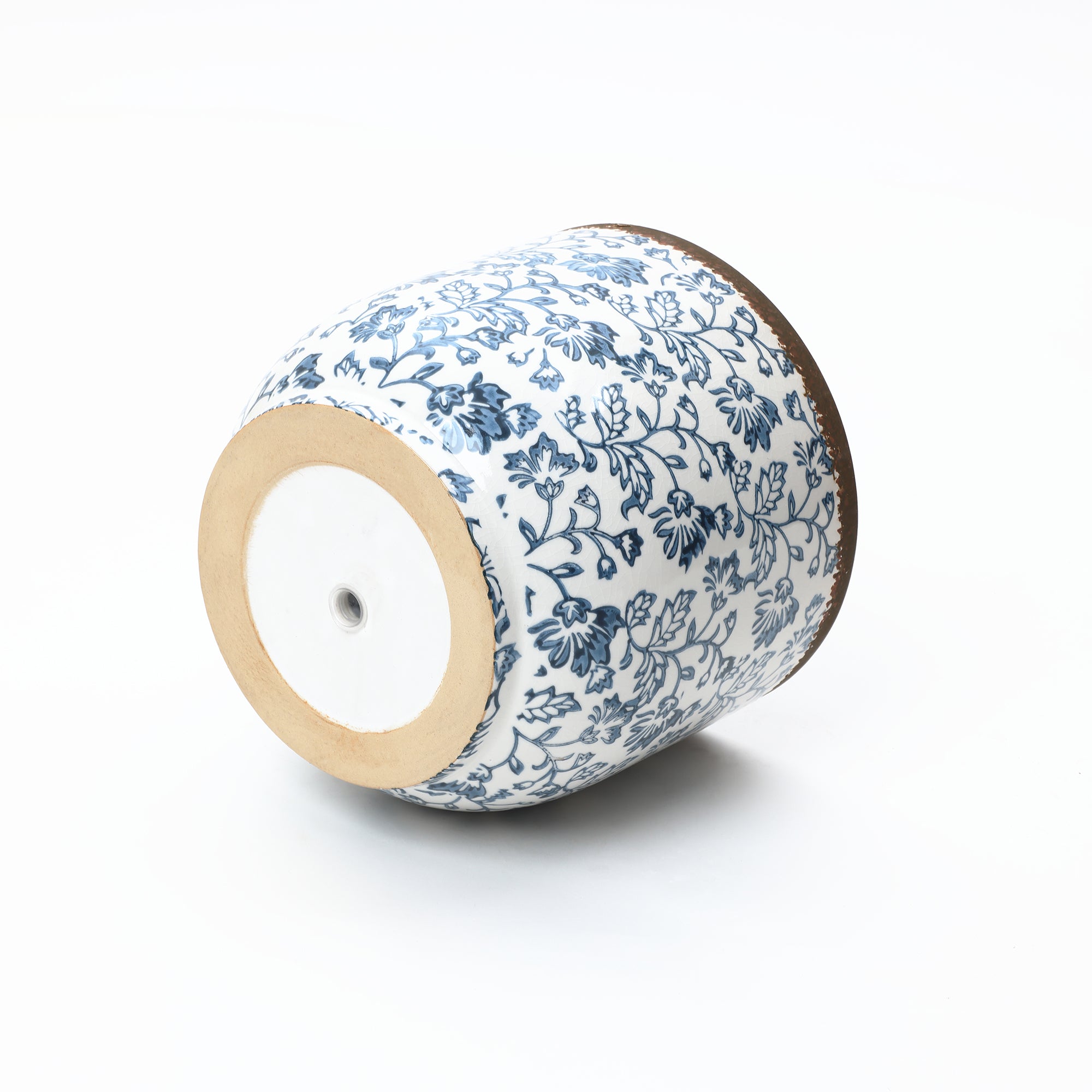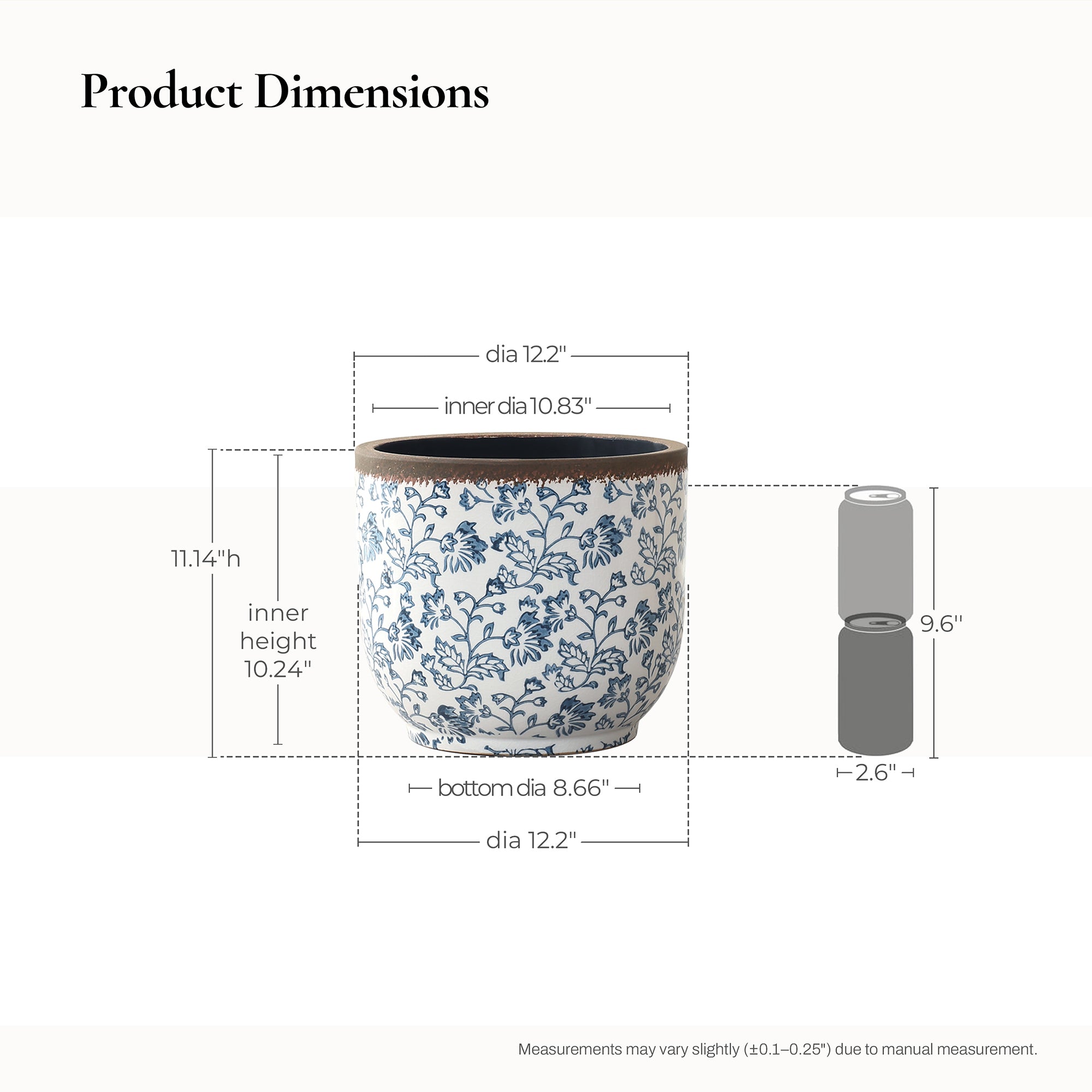 Blue Floral Round Ceramic Planter Indoor & Outdoor Garden Pot, 12.2"