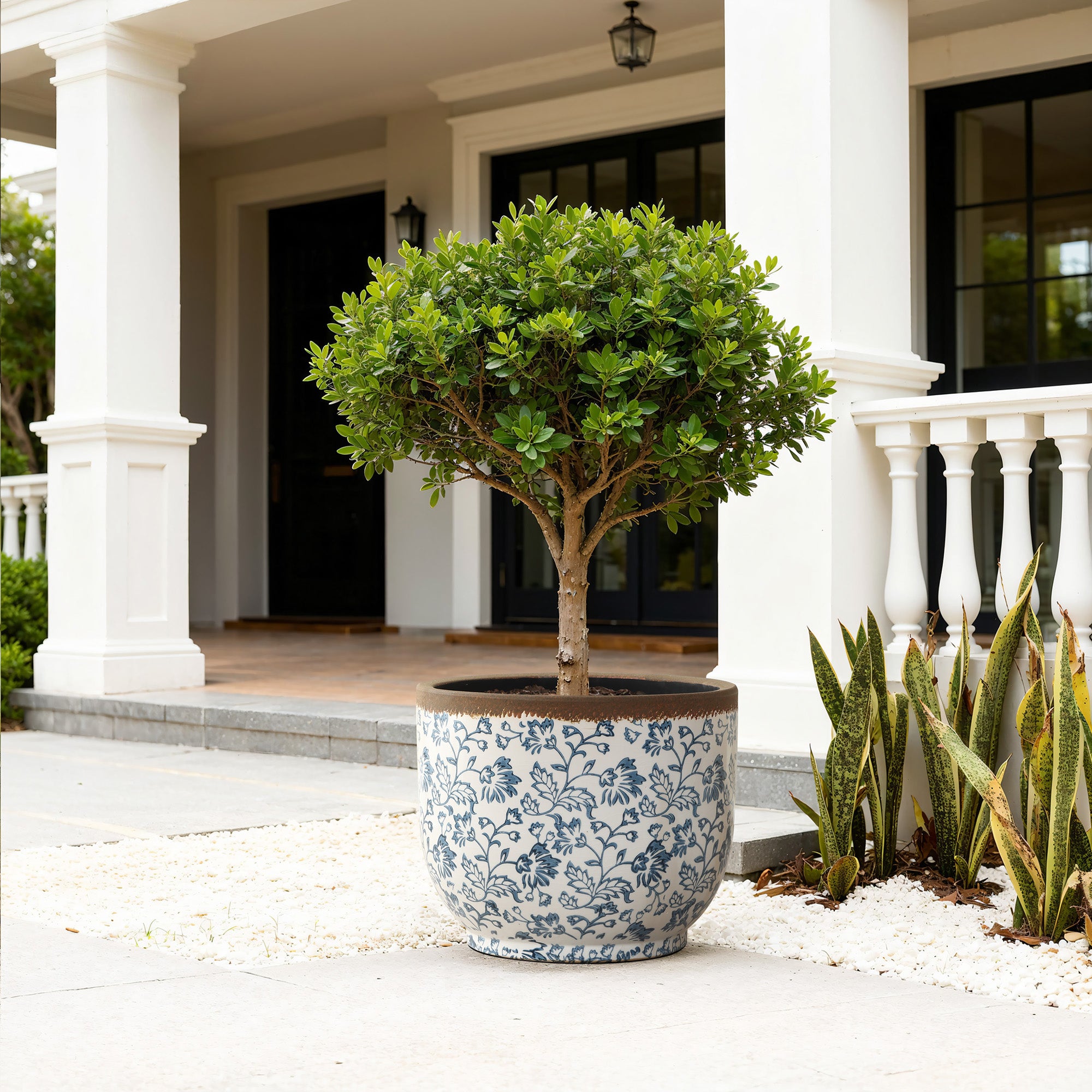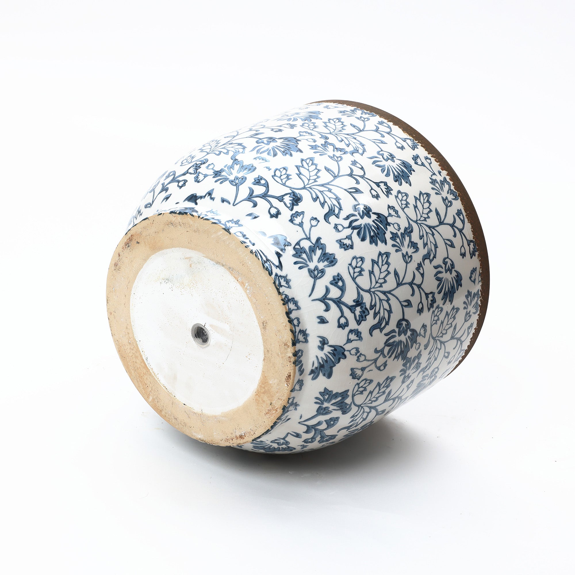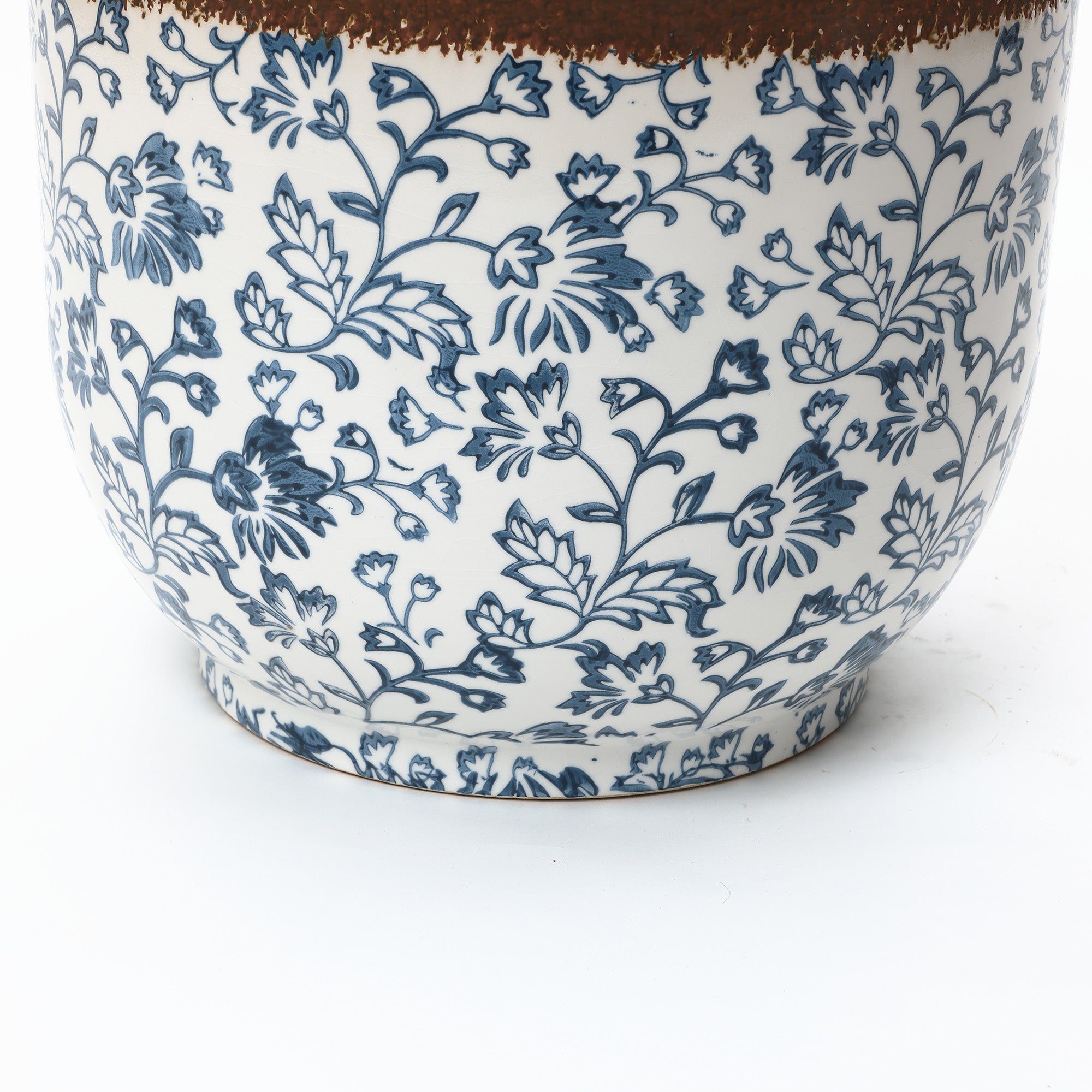 - Elegant Floral Style: Timeless blue floral patterns and a rustic brown rim create a classic ceramic planter.