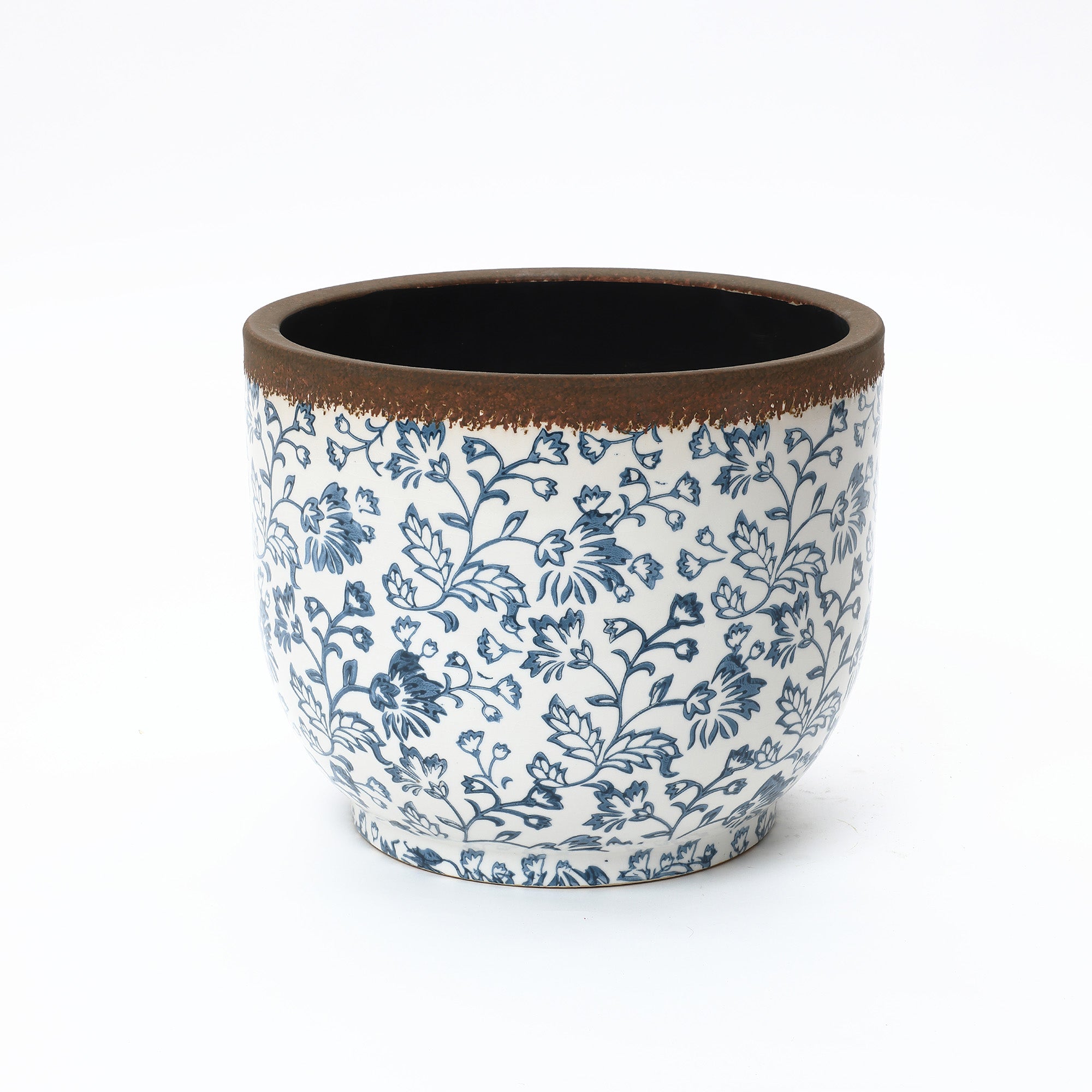 Add a timeless touch to your home or garden with round ceramic planter. Featuring a hand-painted blue floral pattern and a rustic brown rim, boasts a smooth glazed finish and a deep interior, perfect for housing a variety of plants.