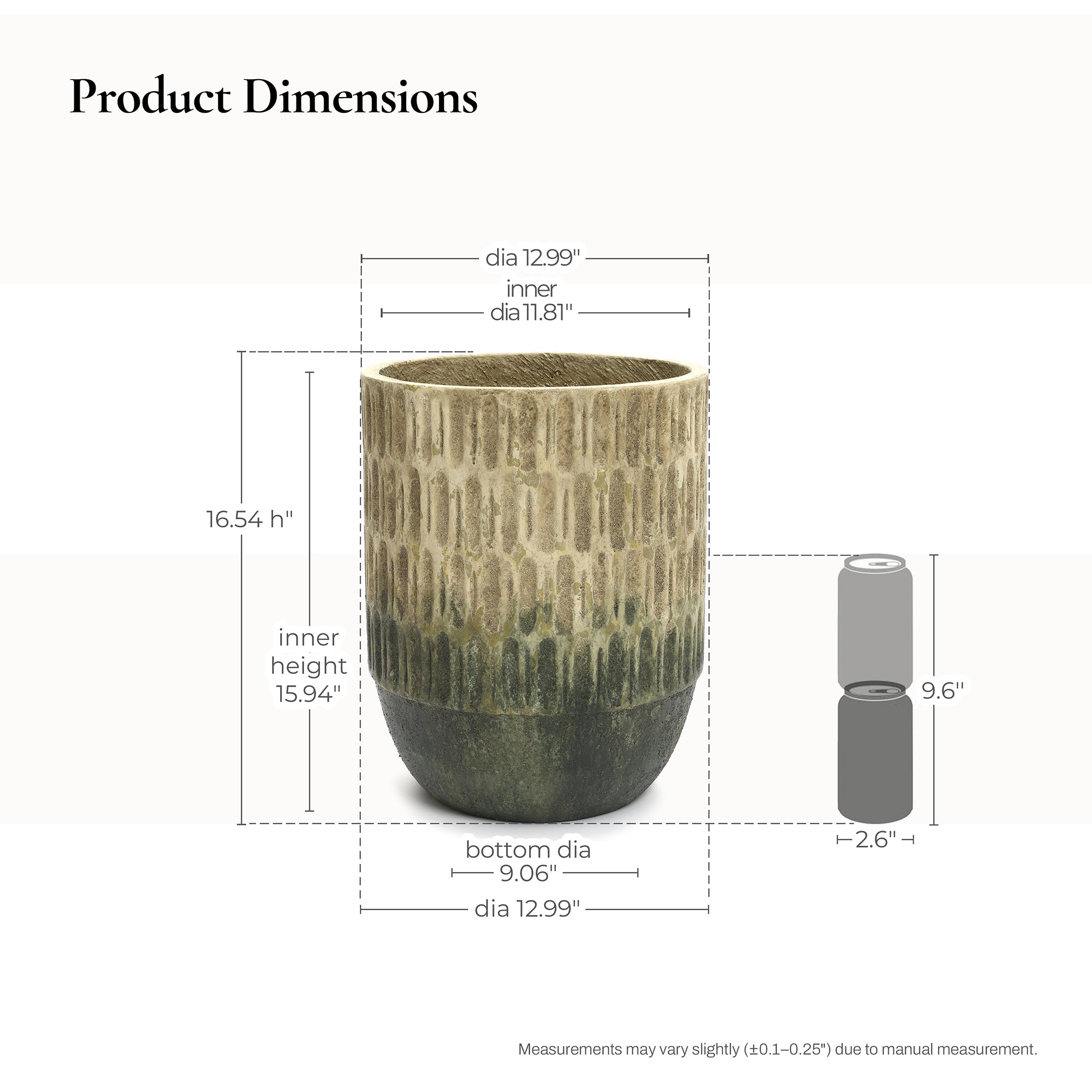 - Size: Measures 13Dia x 16.5''H , 11.8"inner dia, 15.9"for large plants in entryways, patios.