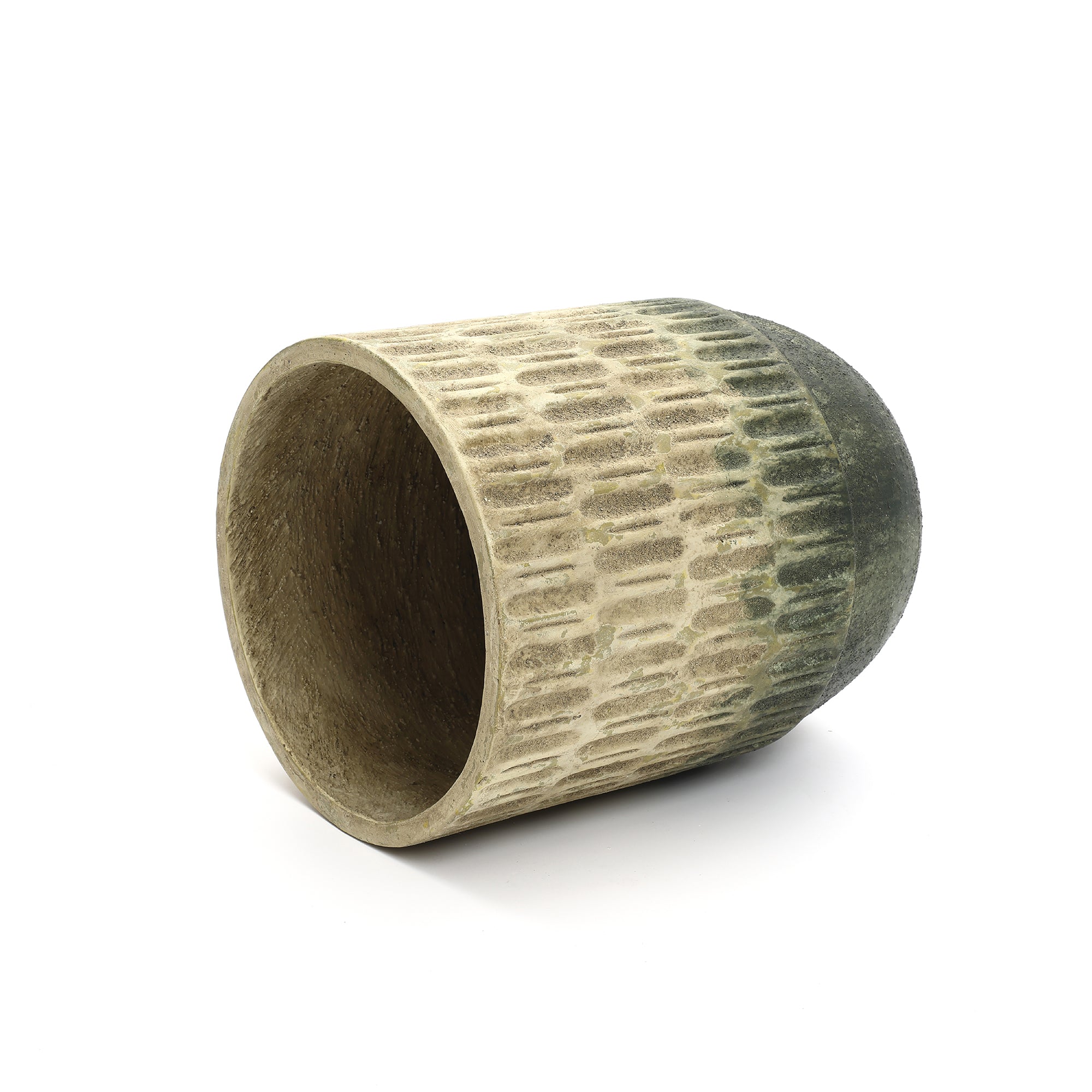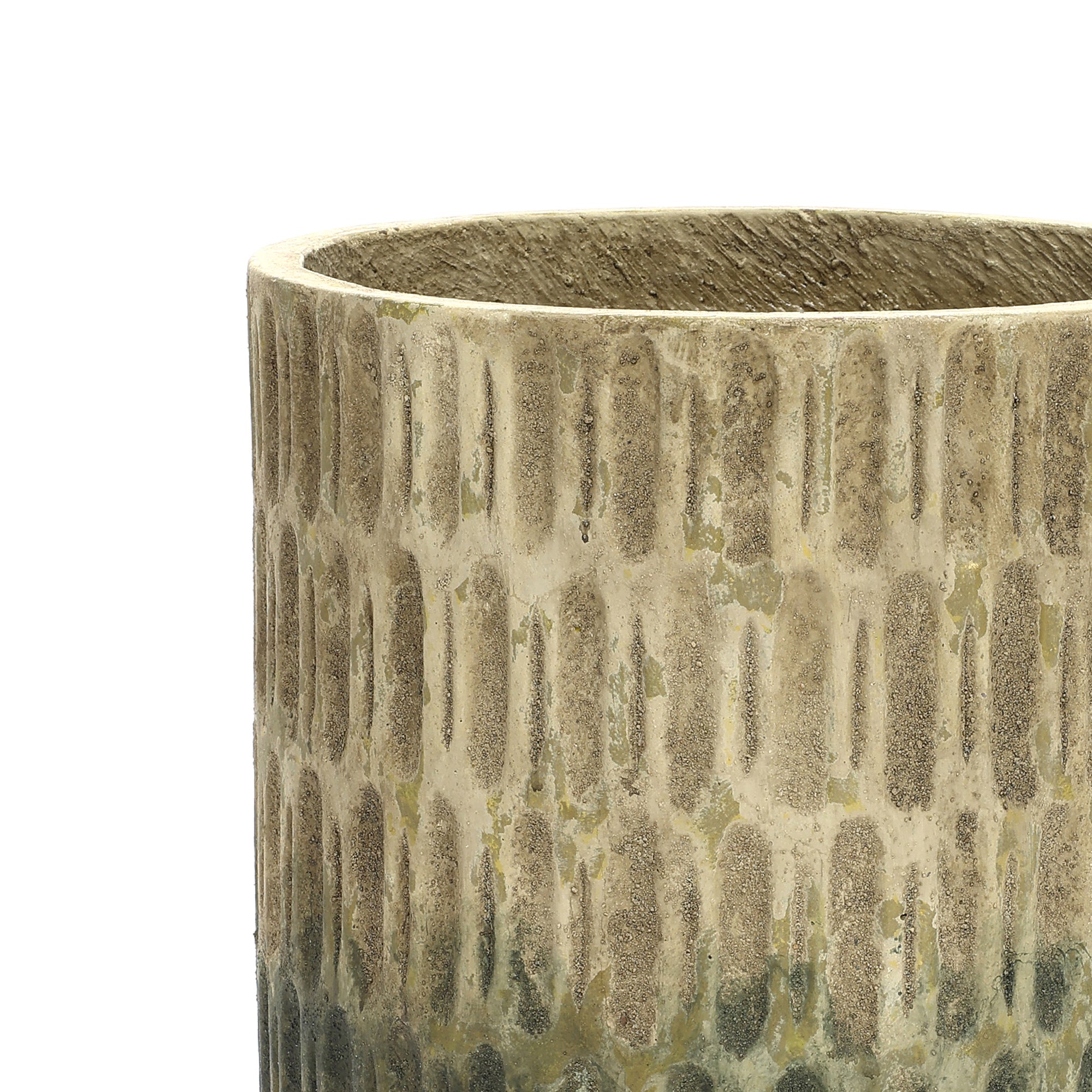 This 16.54'' tall Round Cement Vase. Featuring a vertical carved texture,a hand-applied brown-to-green gradient finish,offering both style ,functionality.
