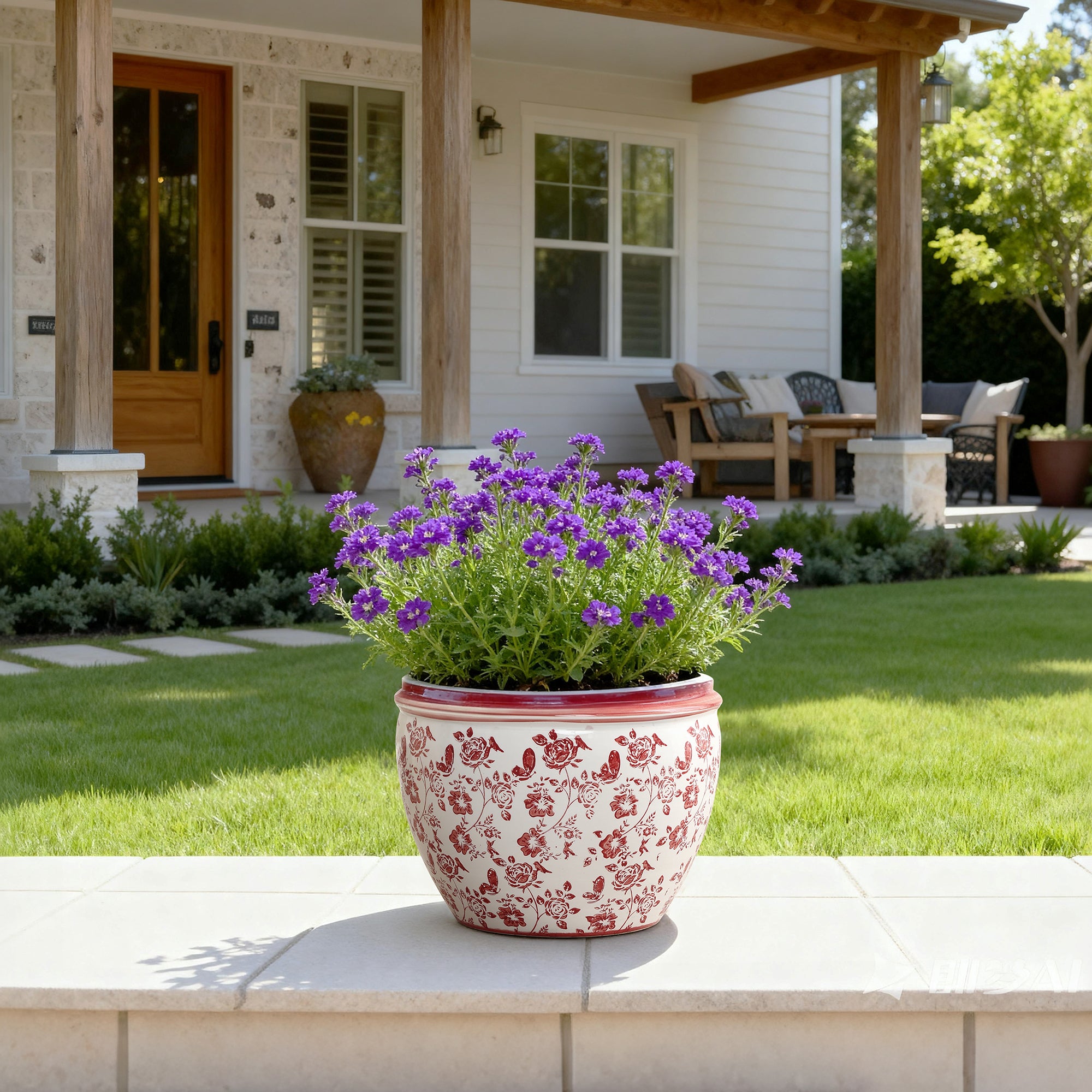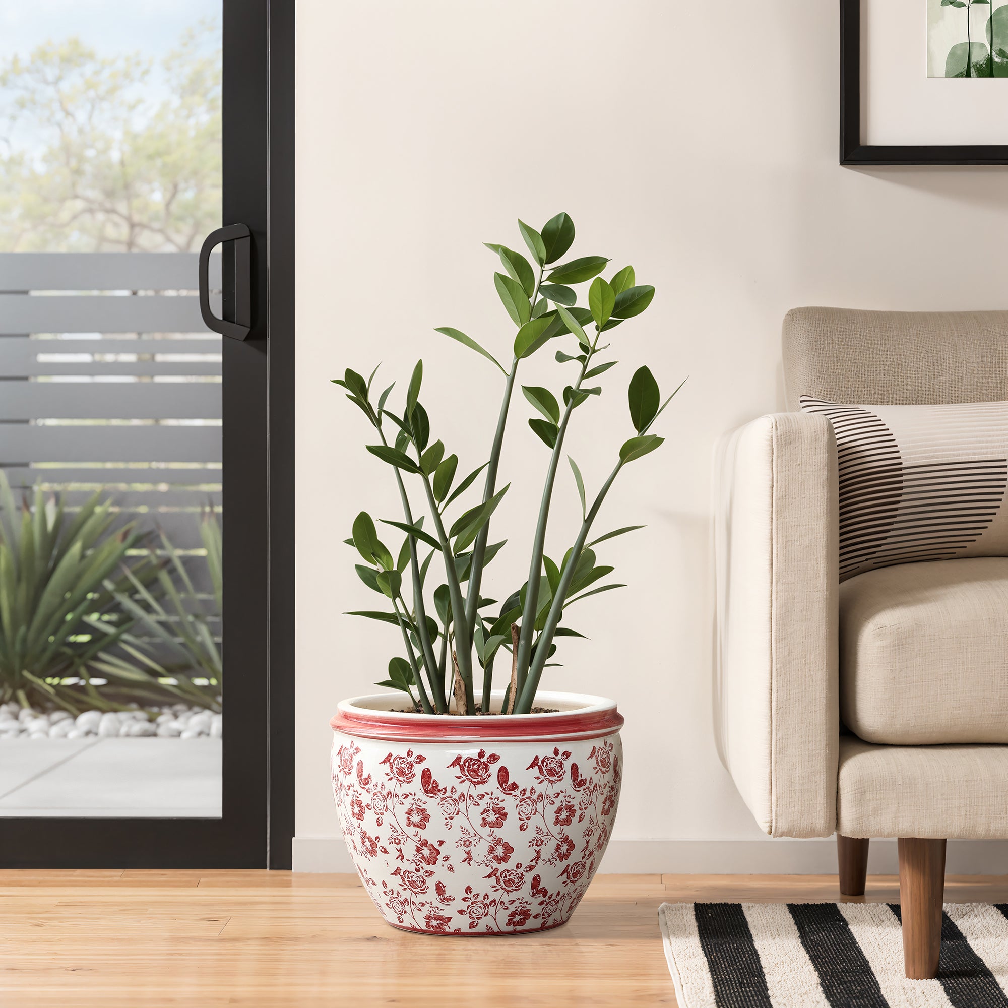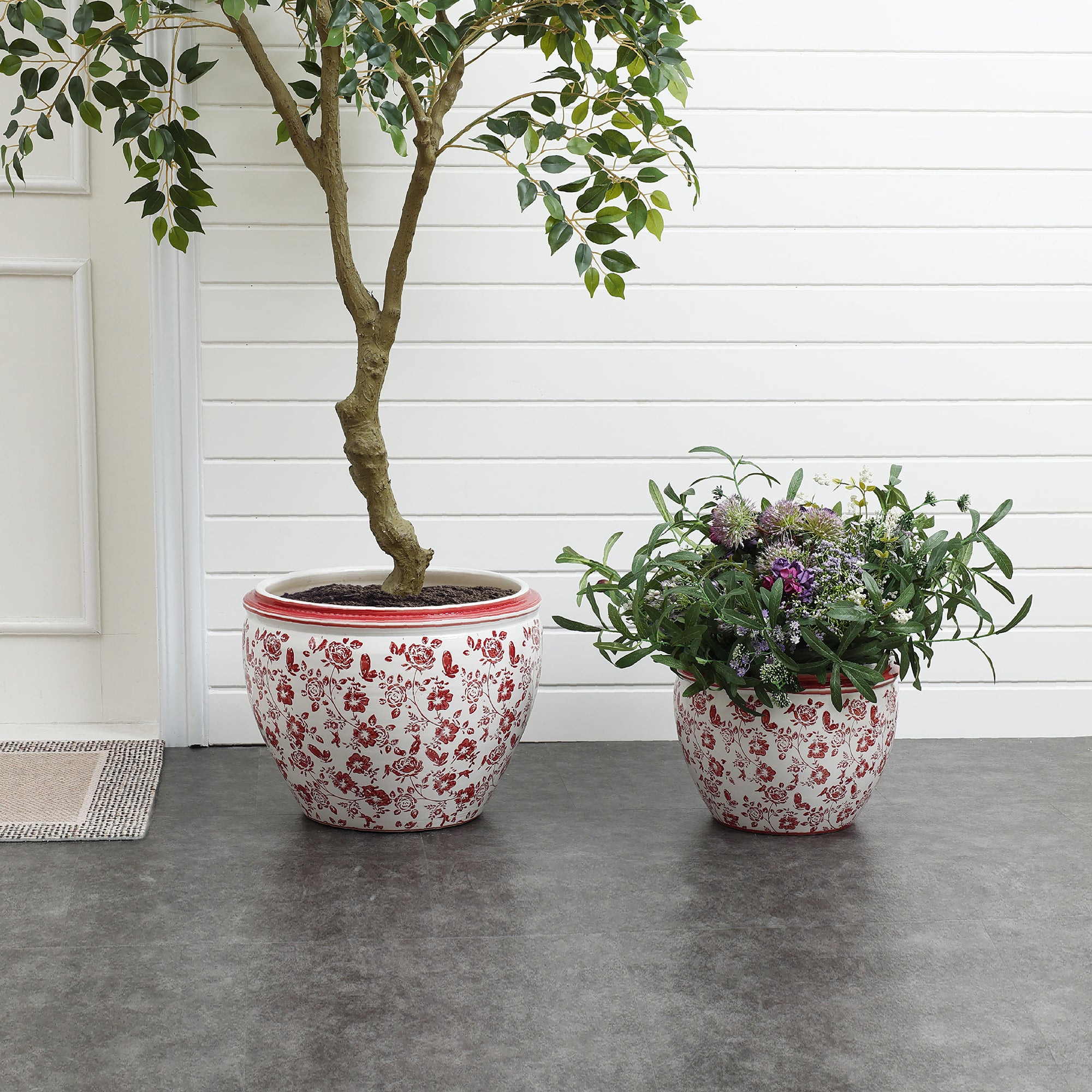 Crafted from durable ceramic, offers spacious 12'' opening, perfect for larger flowers, green plants, small trees. The vibrant red floral design pops creating an eye-catching accent piece that enhances any decor.