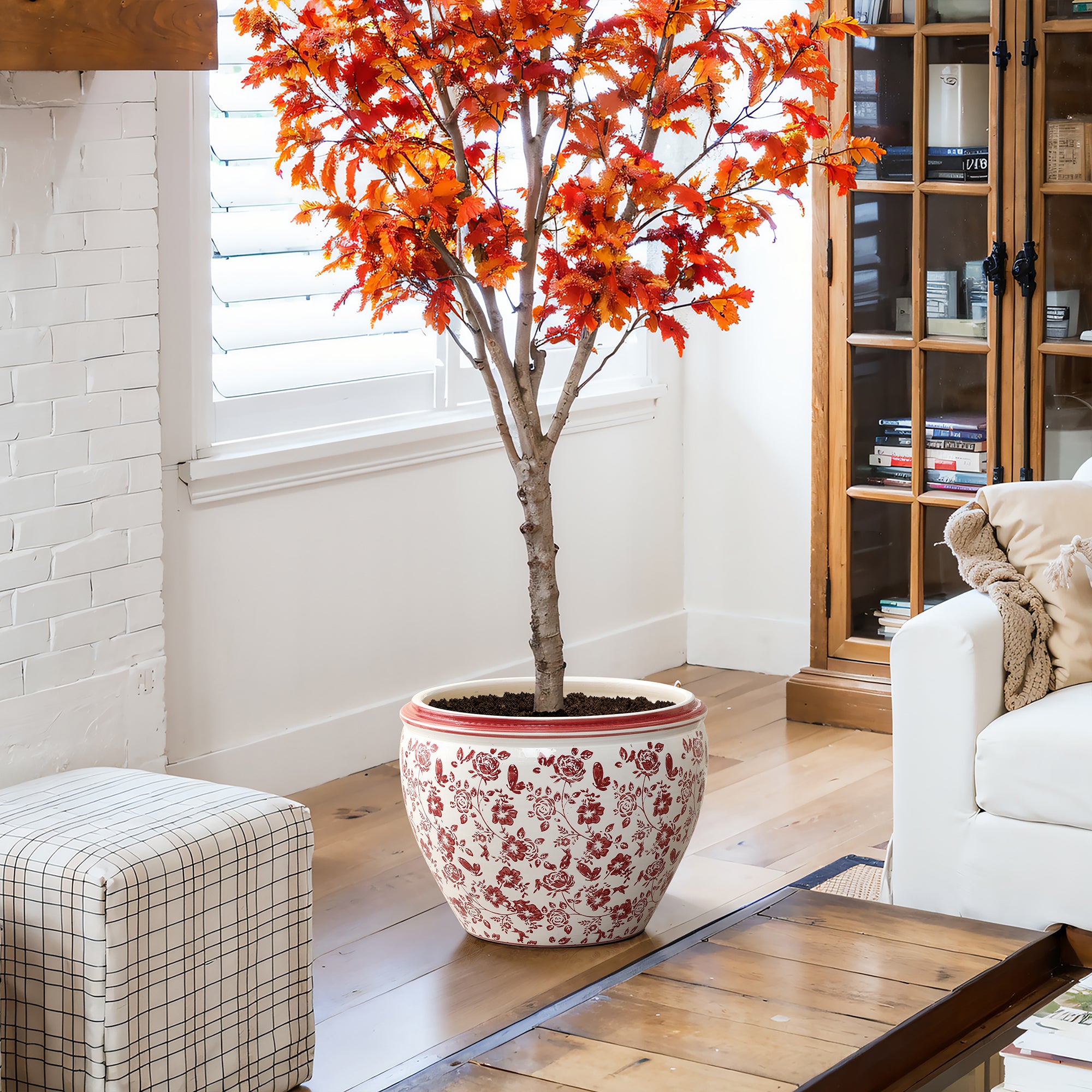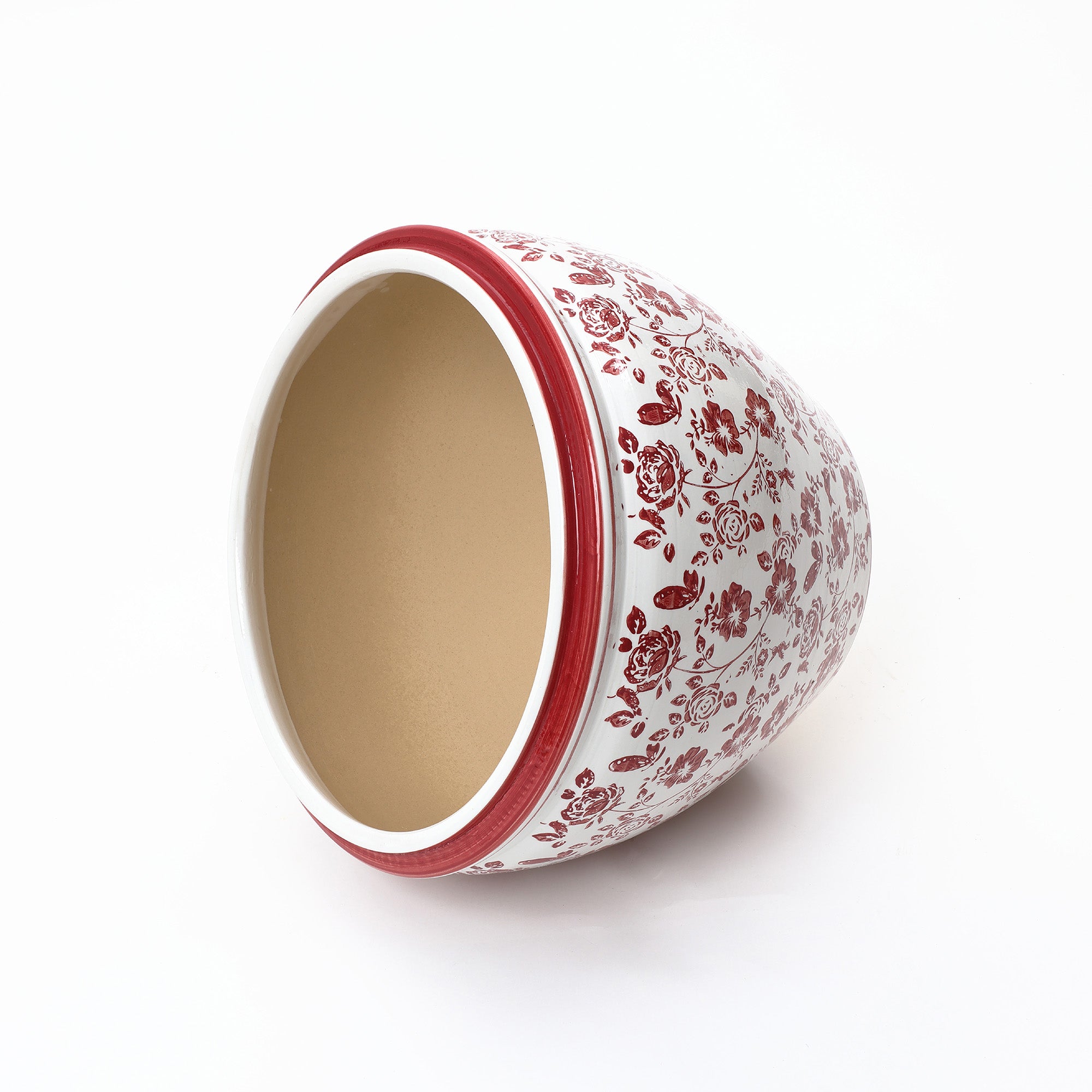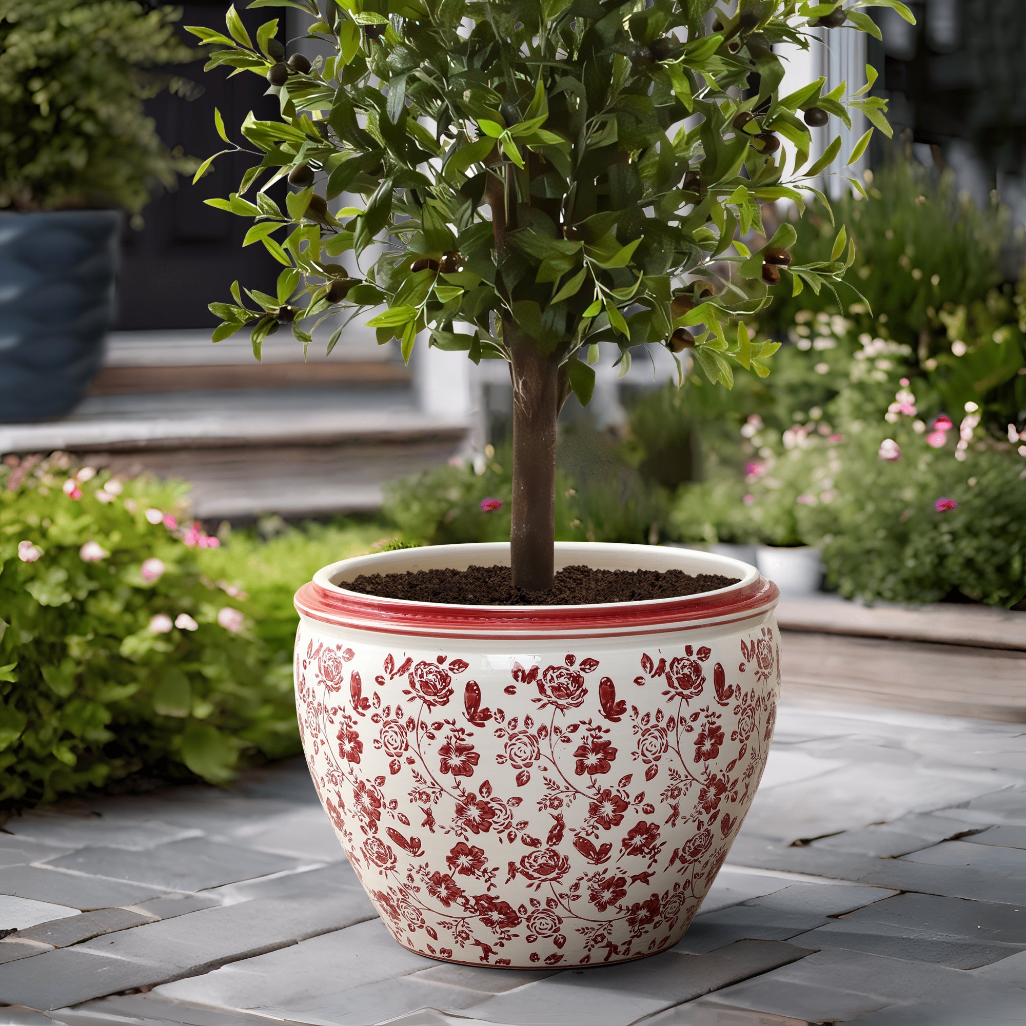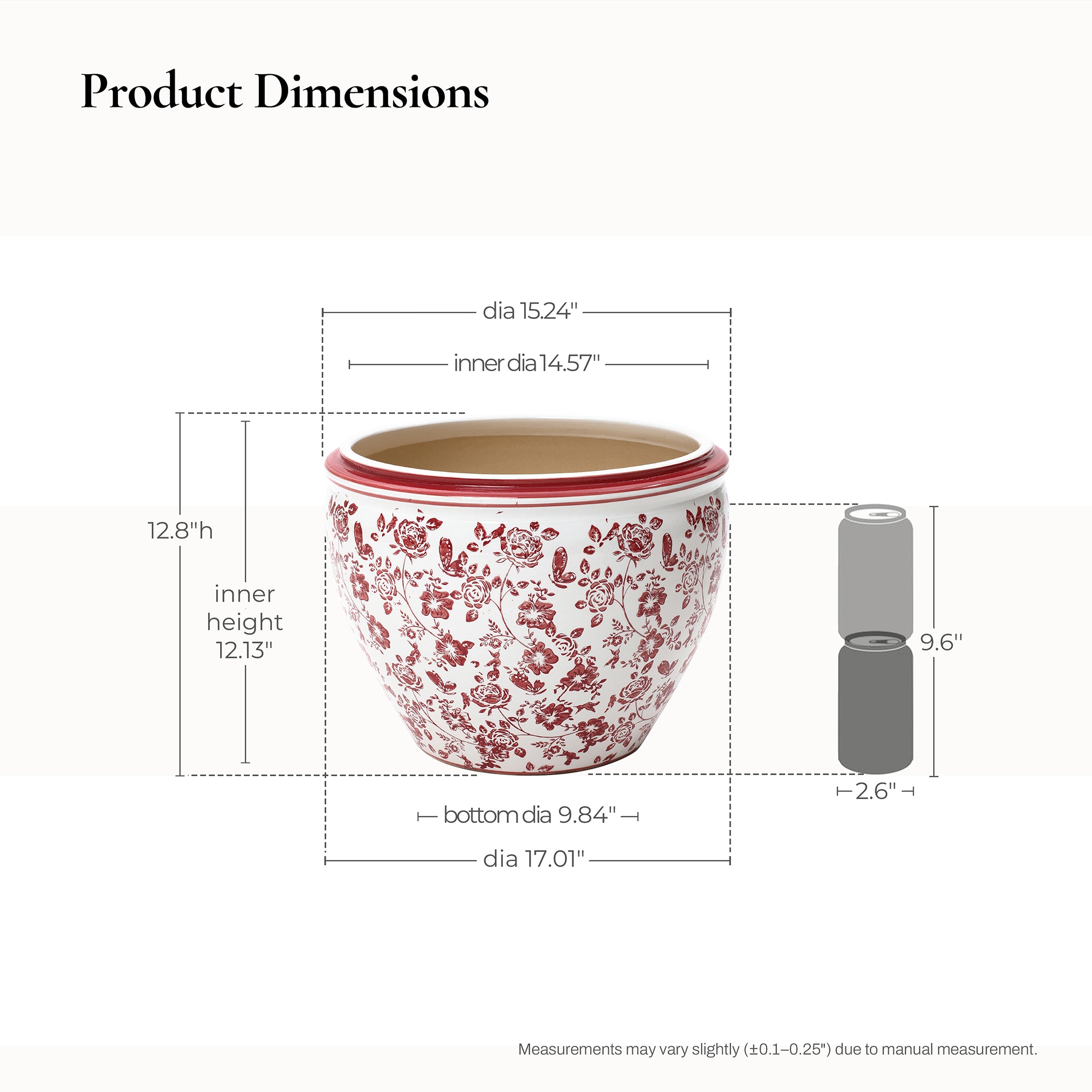 Crafted from durable ceramic, offers spacious 17'' opening, perfect for larger flowers, green plants, small trees. The vibrant red floral design pops creating an eye-catching accent piece that enhances any decor.