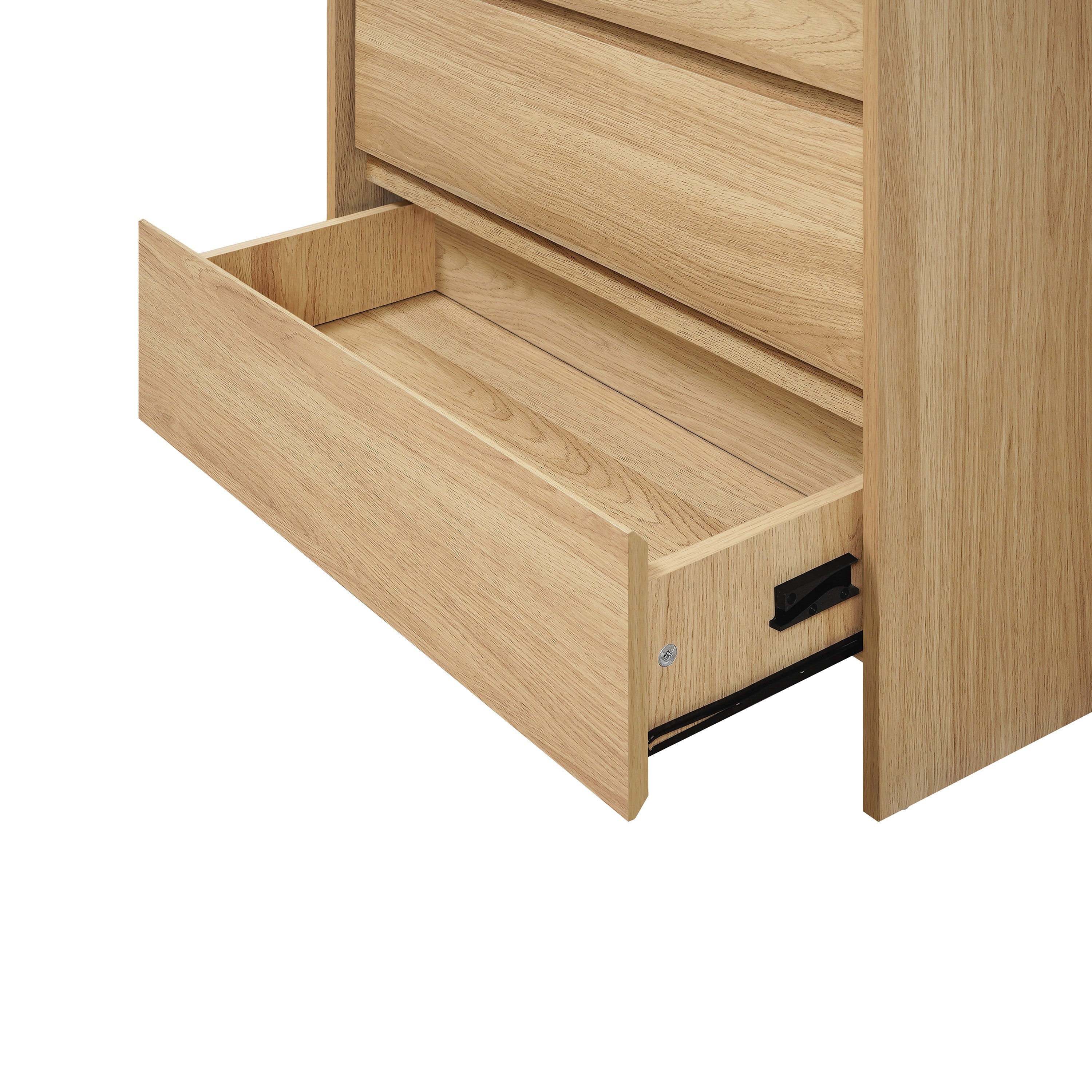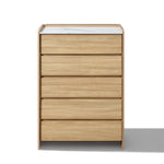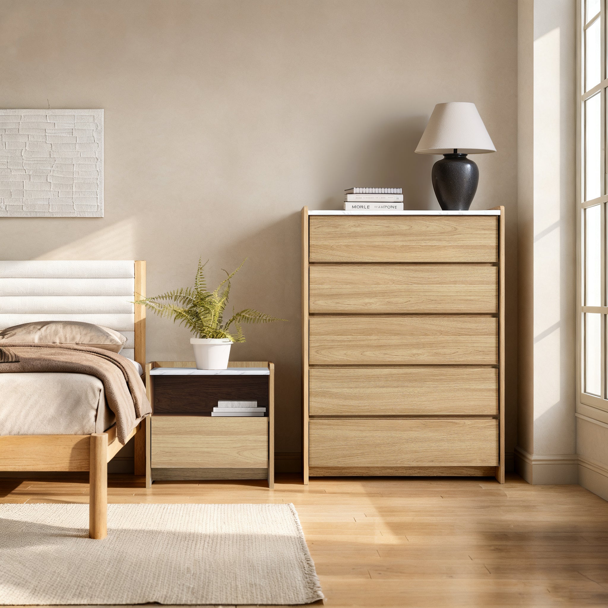This 5-drawer Wood Storage Chest, designed to bring both style organization into your home. With warm light oak wood grain paired with sleek faux marble top, adds touch of modern elegance to any room.