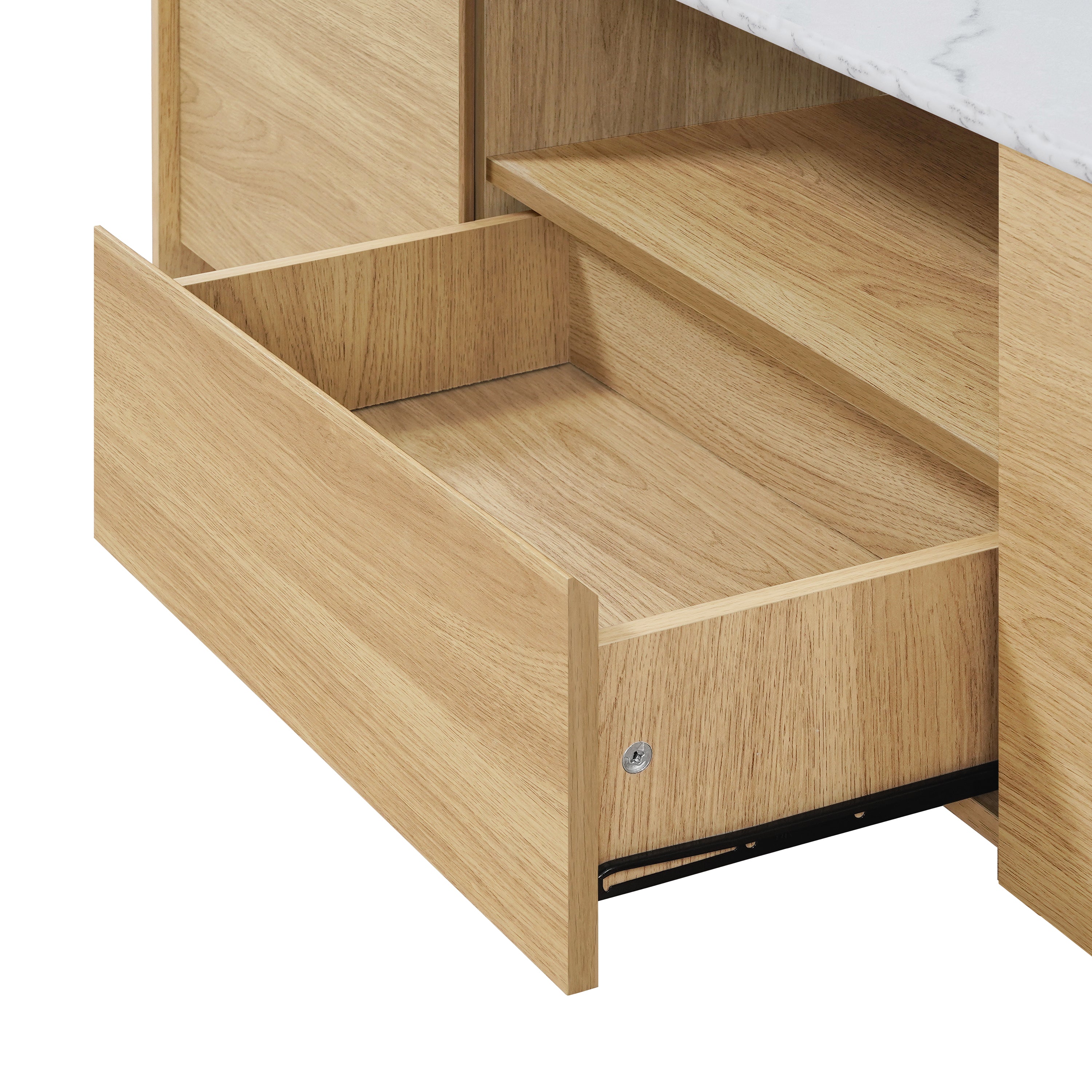 - Handle-Free Design:The beveled door, drawer edges act like built-in pulls. Rounded corners help the unit sit nicely.
