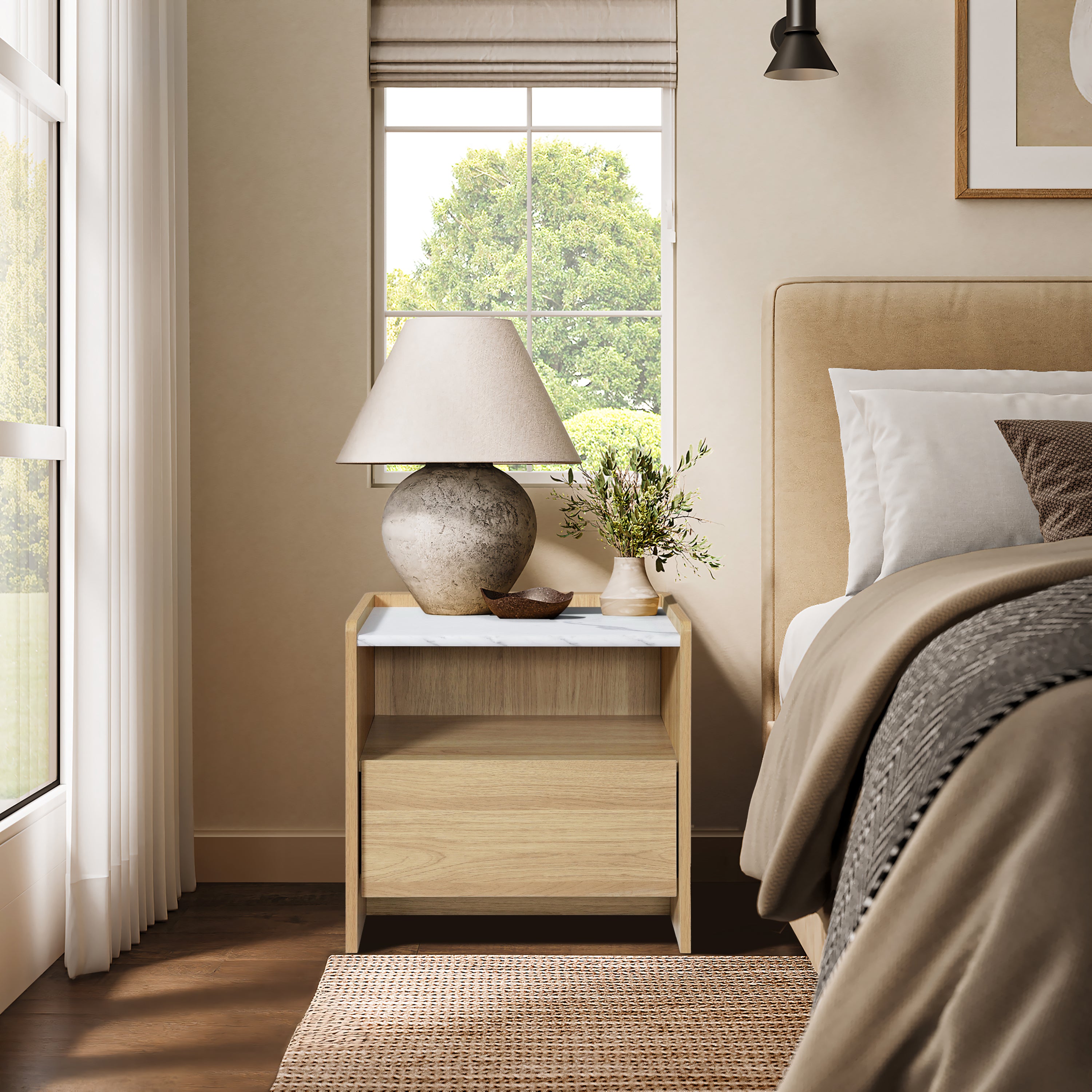 This Wood Storage End Table. Featuring faux marble top ,warm oak wood finish,adds touch of sophistication. Perfectly suited for Japandi, Scandinavian, contemporary interiors.
