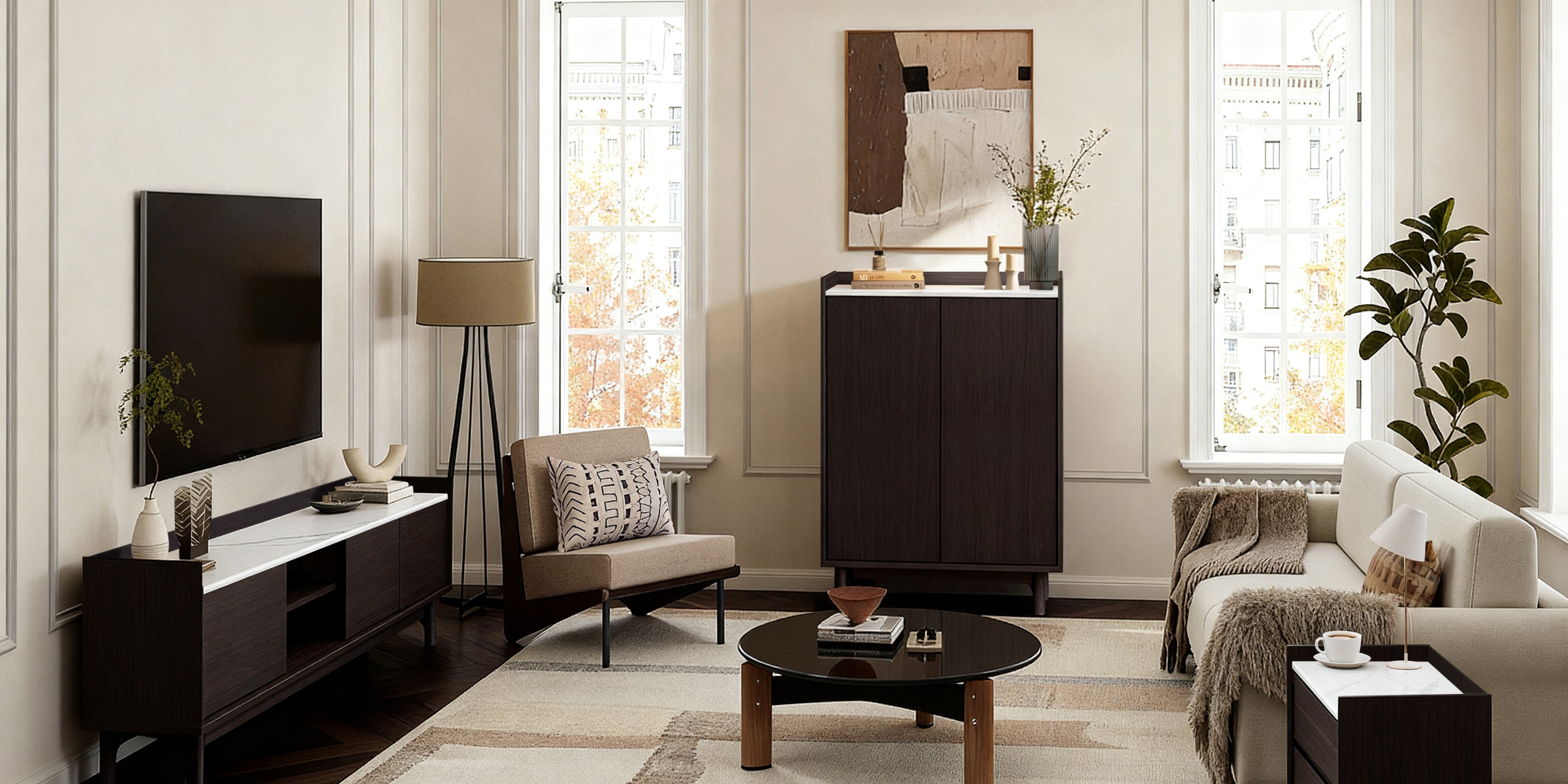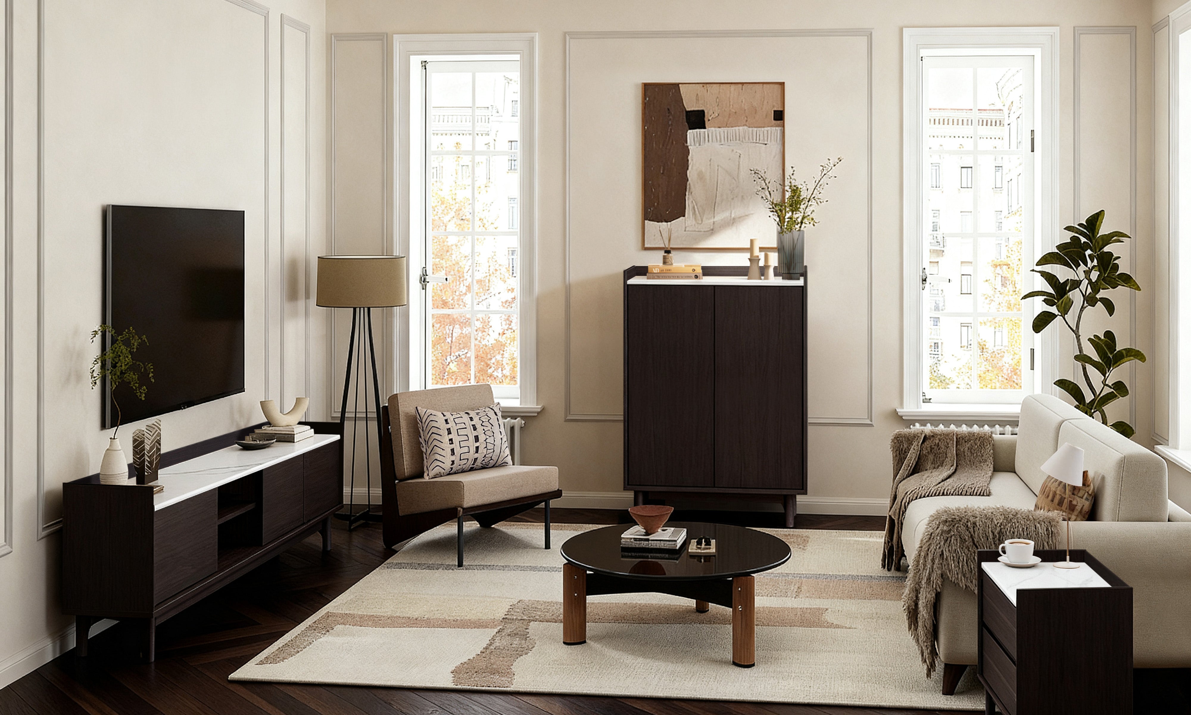 Blending rich wenge wood tones with a refined faux marble finish, Modi redefines modern living with its sleek, two-tone aesthetic. Thoughtful details—raised tray edges, rounded corners, and handle-free doors—bring style and practicality into perfect balance.