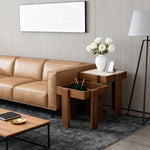 This wood side table brings a sleek, modern touch to your home with its minimalist design and versatile functionality. Featuring two nesting tables, it offers flexible space-saving options while maintaining an elegant, timeless aesthetic.