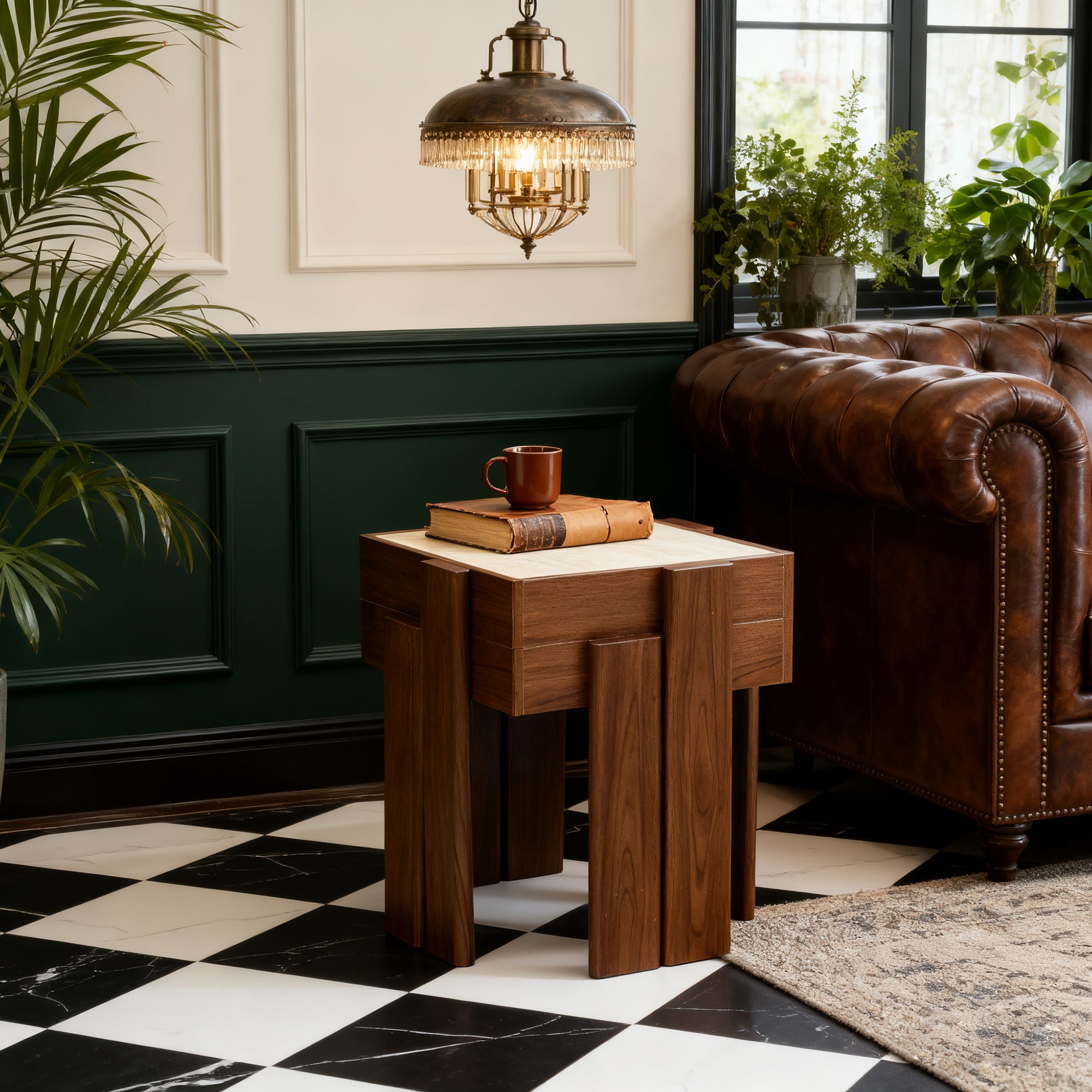 Wood Side Table with Marble-Inspired Design for Living Room & Bedroom