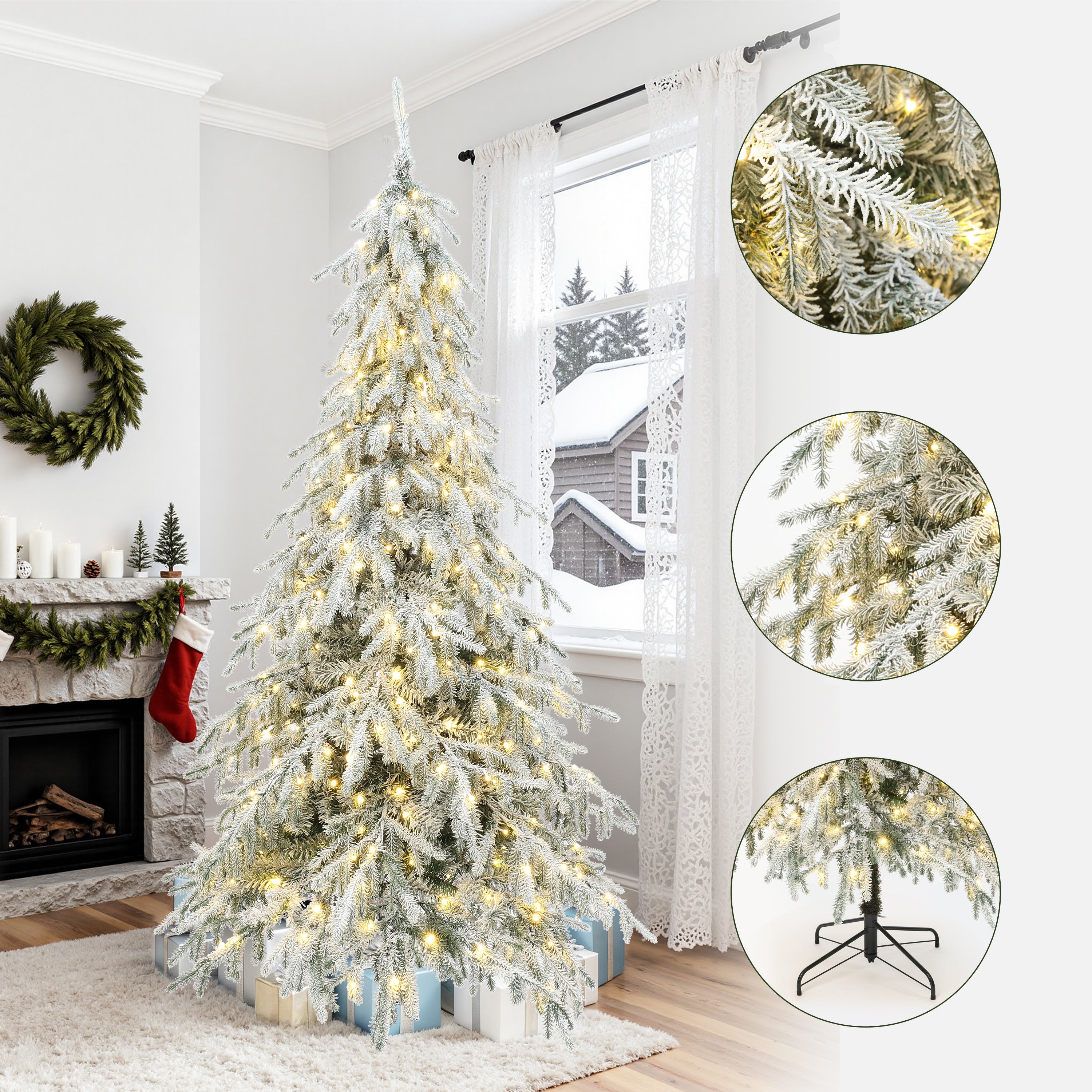 This 7.5ft pre-lit flocked christmas tree. With 2,087 branch tips made from a mix of PE and PVC, mimics the gentle beauty of a winter wonderland.